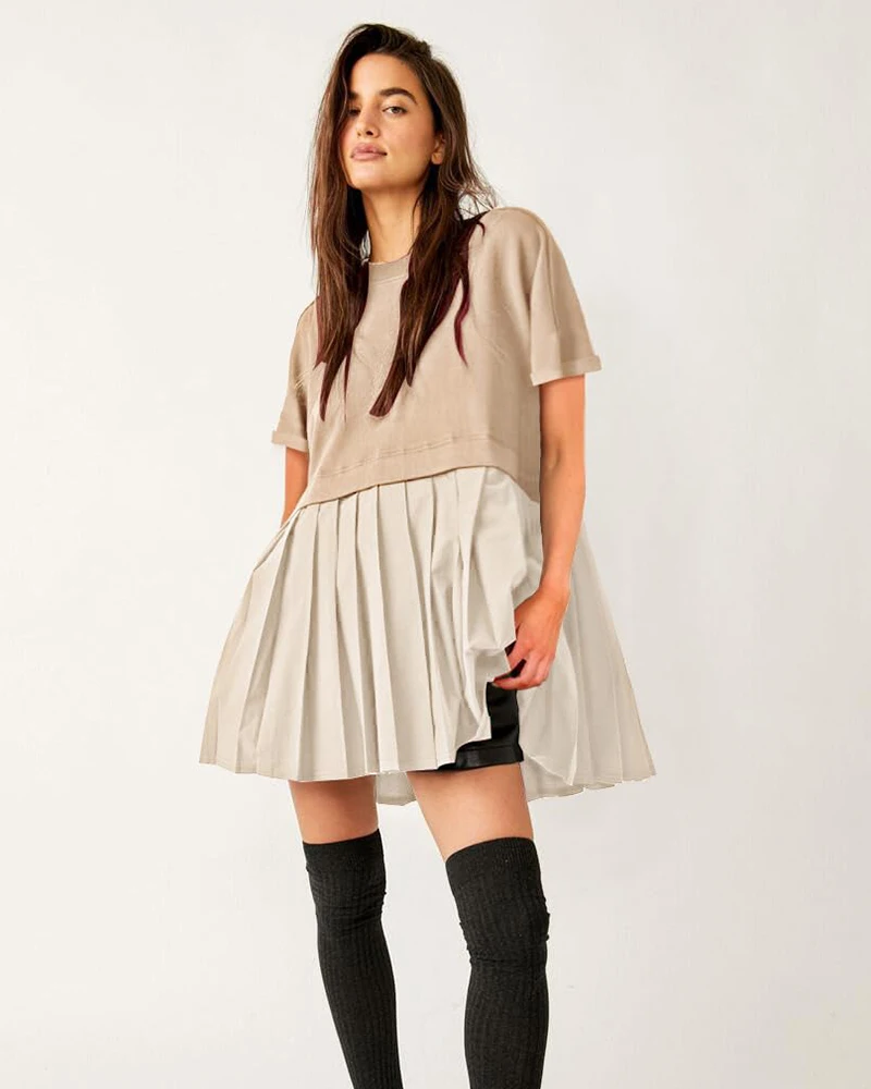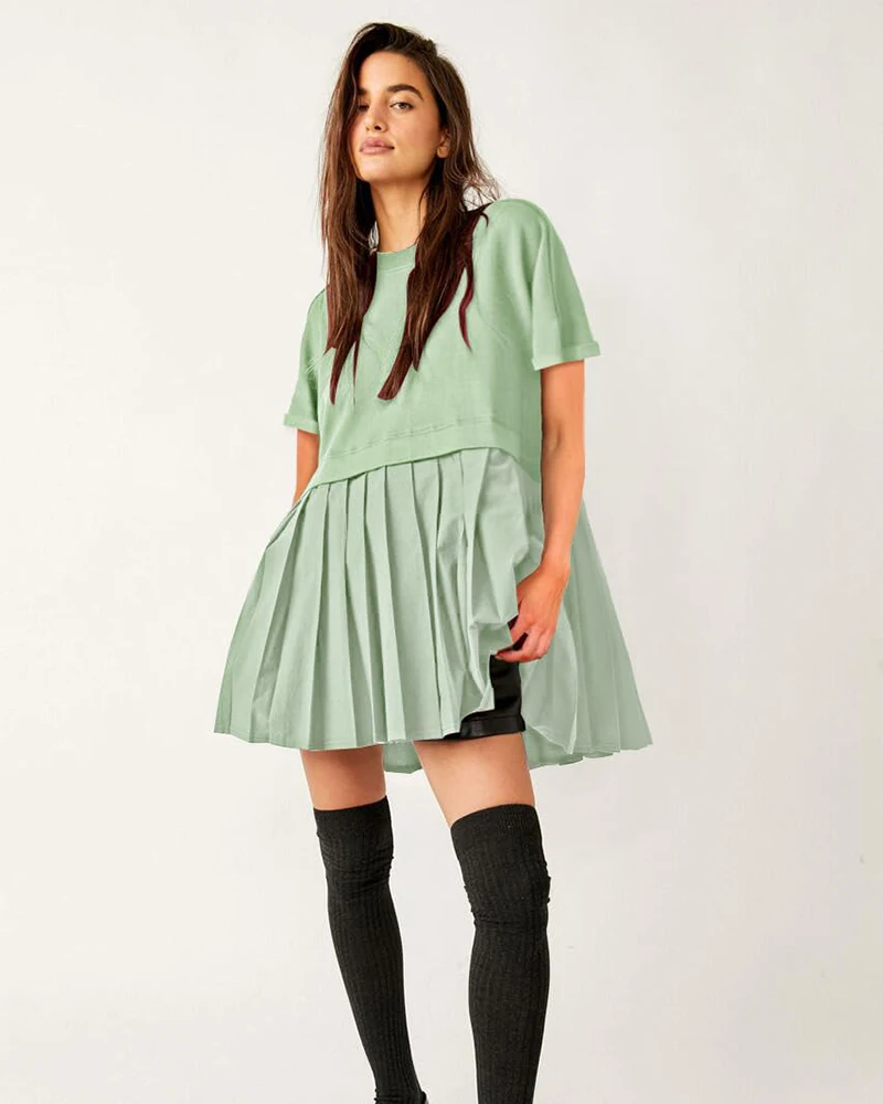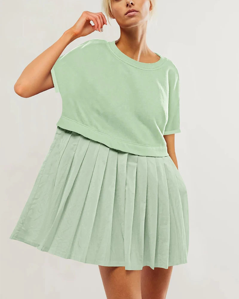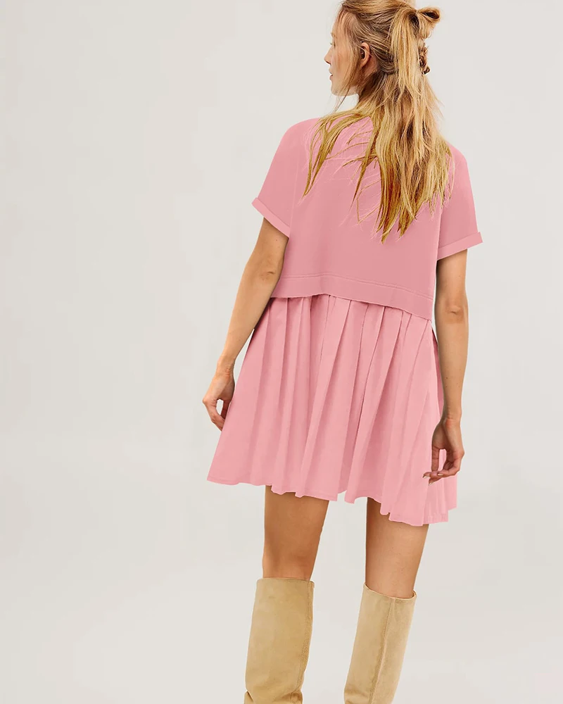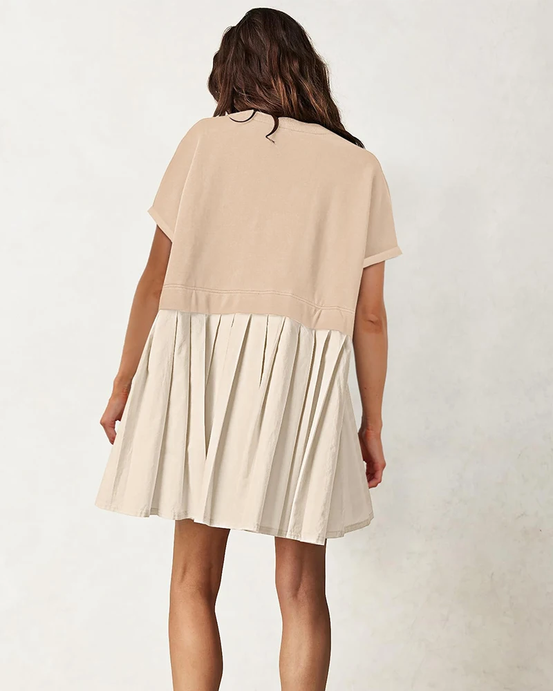 New Design Preppy One Piece Dresses 2026 Summer Short Sleeve Crew Neck Patchwork Pleated Mini Dresses Flowy Daily Wear