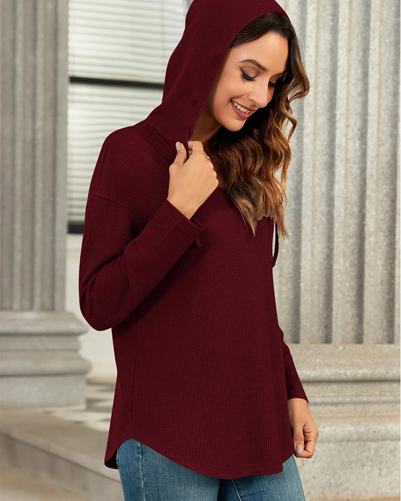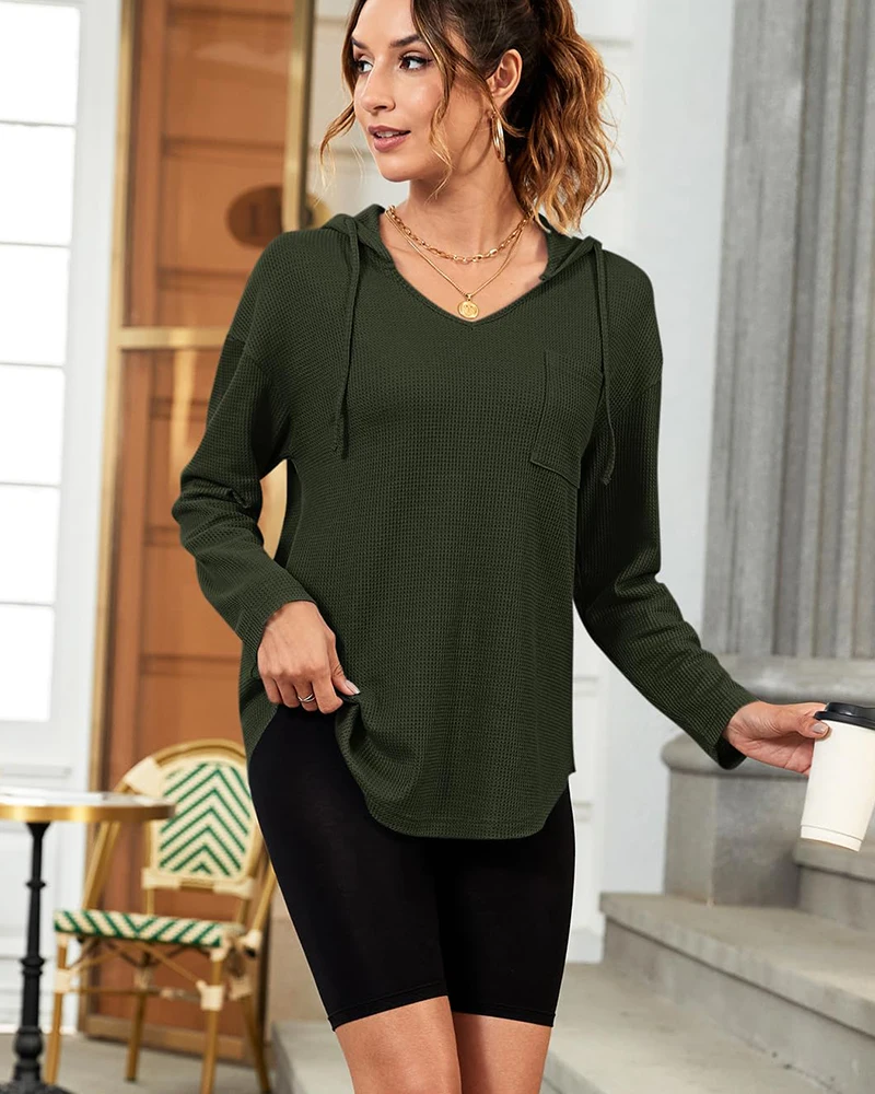 Women's Waffle Knit Hoodie V-Neck Long Sleeve Oversized Casual Pullover with Pocket Fall 2026 Trendy Loose Sweatshirt for Ladies