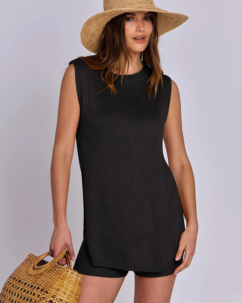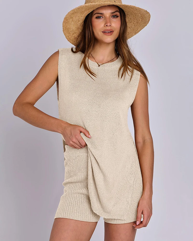 Women's Vacation Holiday Outfits Fashion 2pieces Set Sleeveless Sweater Loose Tunic Shirt Top Knitted Shorts Casual Lounge Suit