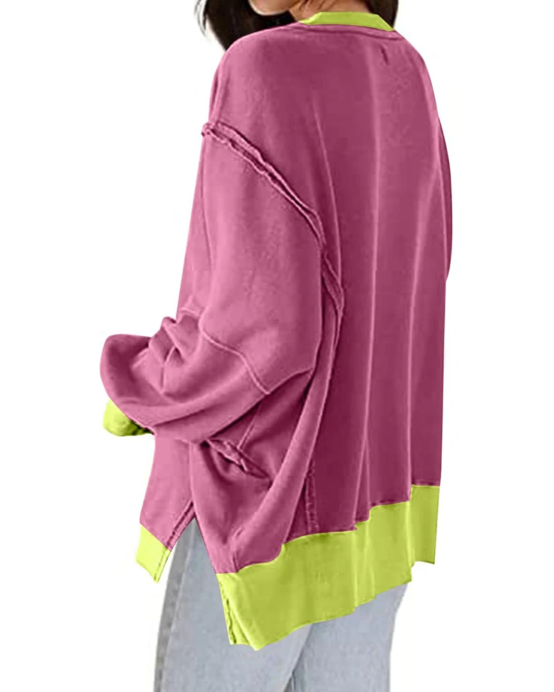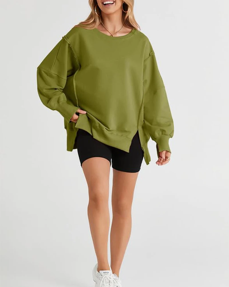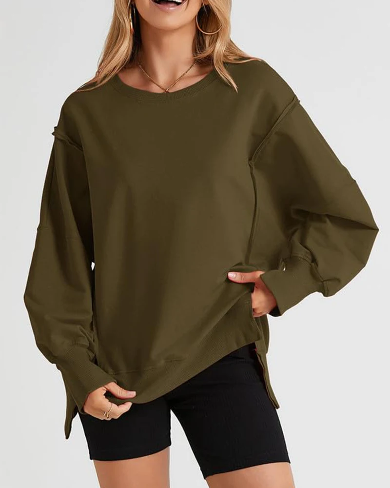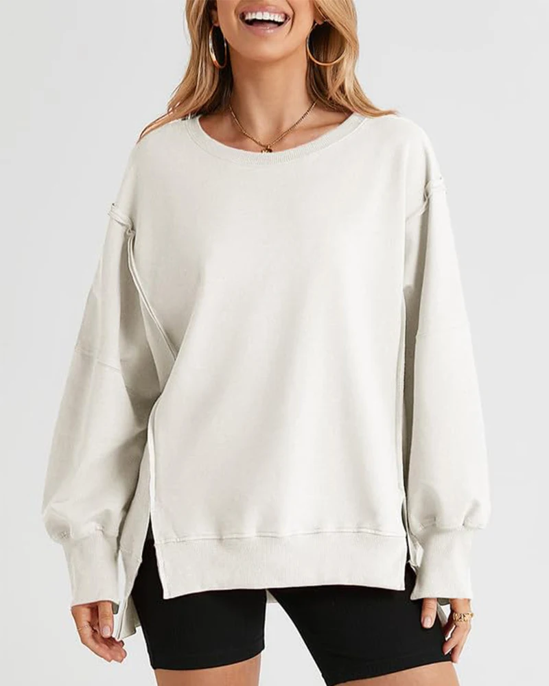 2026 New Women's Oversized Side Slit Sweatshirt Multi-Color Casual Loose Round Neck Long Sleeve Pullover Top Autumn Winter