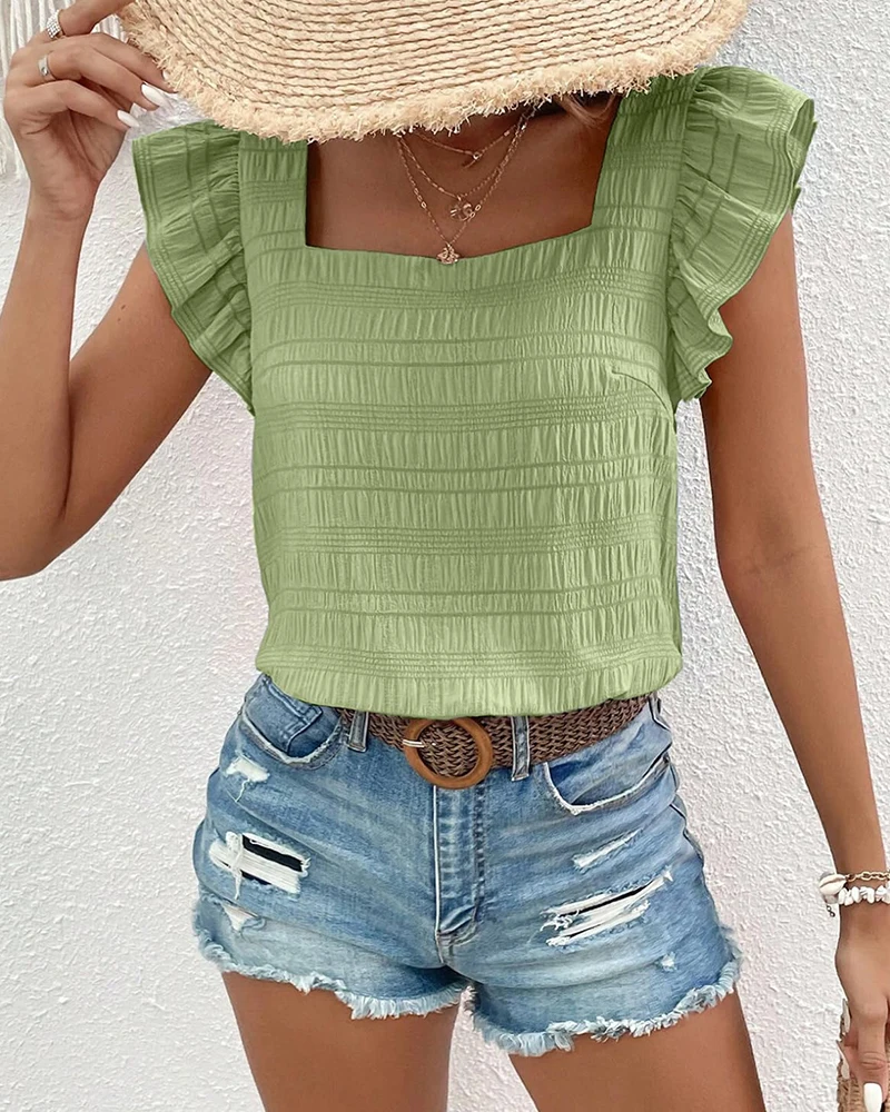 2026 Summer Women's Chic Solid Color Ruched Square Collar Ruffle Short-Sleeve Tee Breathable Slim-Fit Fresh Casual Style Tops