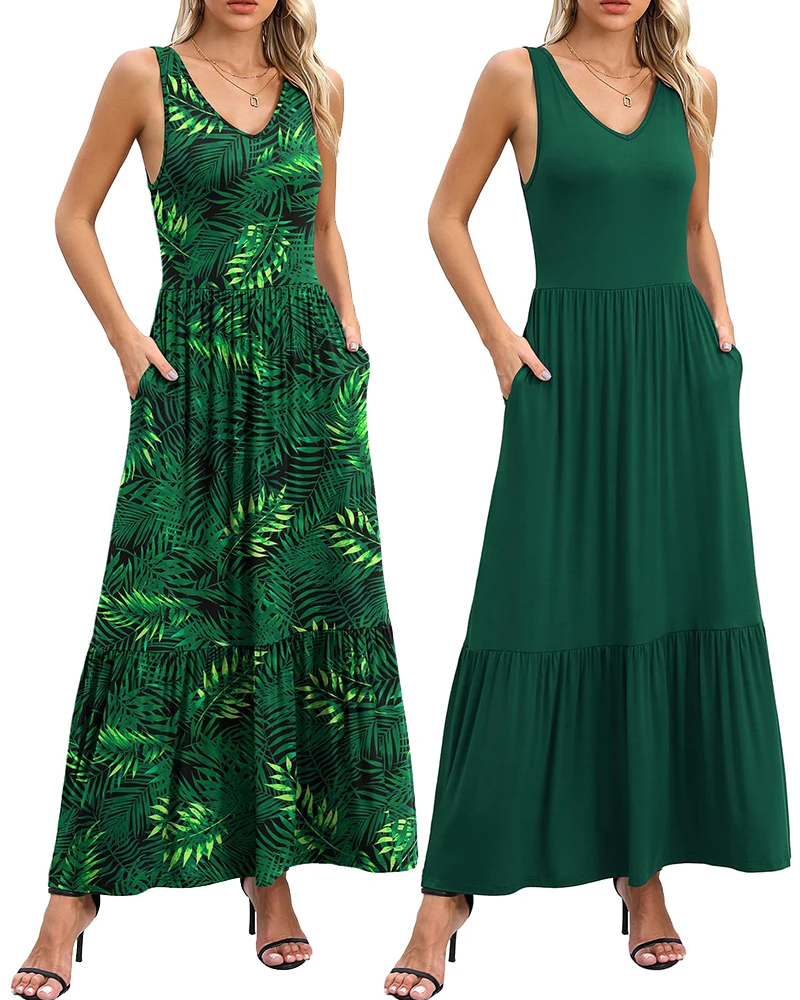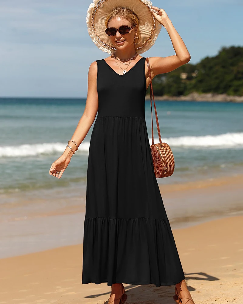 OWN Factory Produces Women's Simple V-Neck Sleeveless Dresses With Layered Flowing Loose Long Maxi Dresses With Pockets