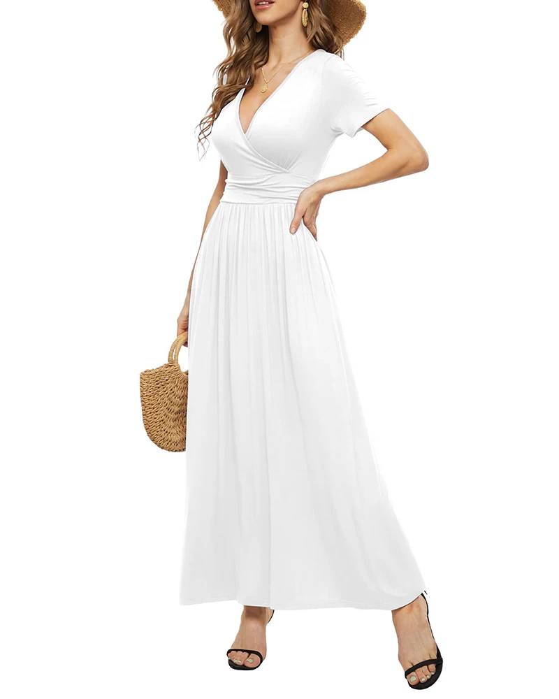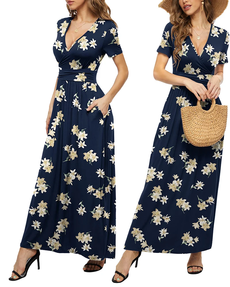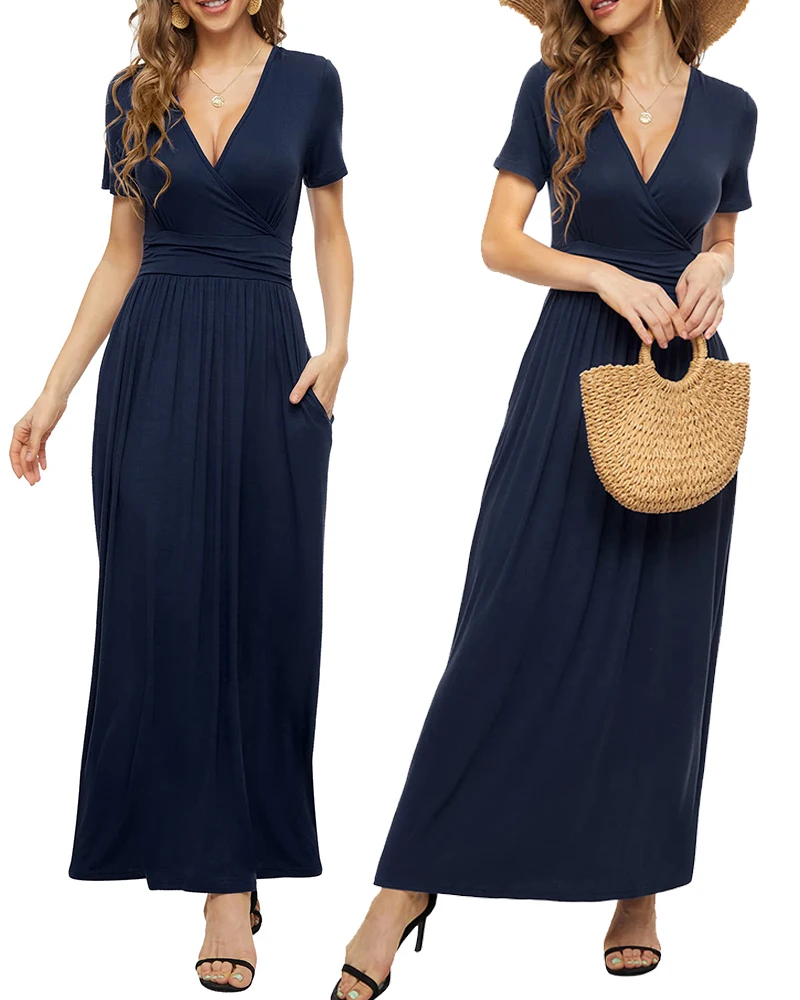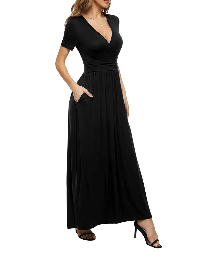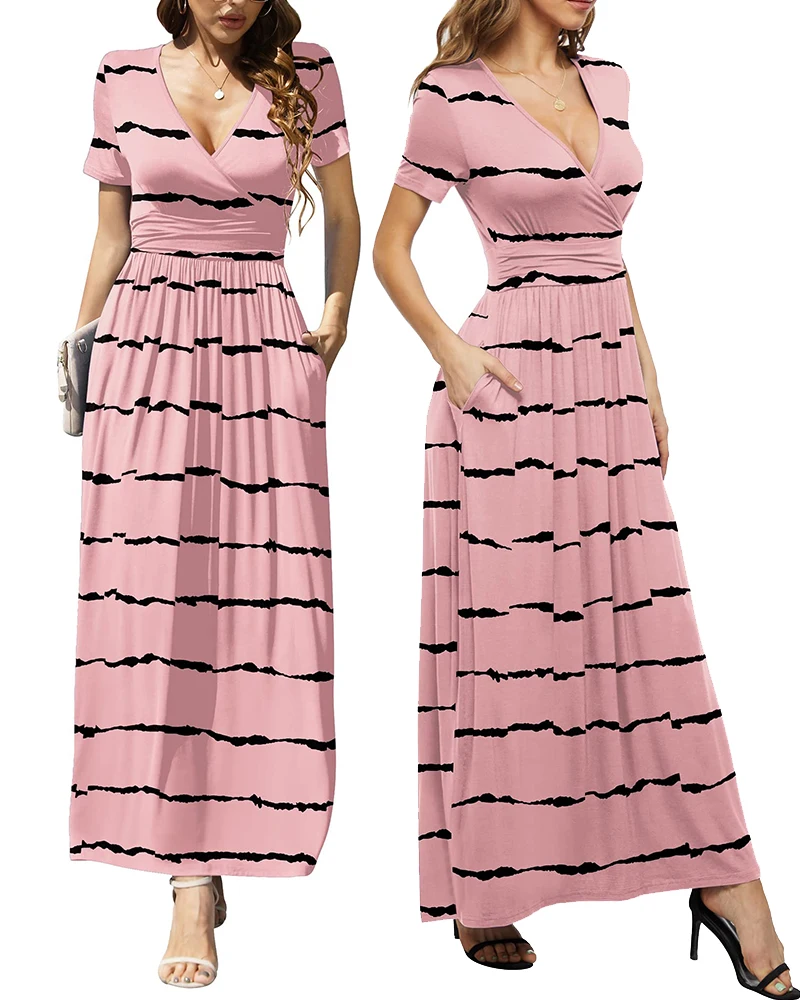 2026 Independent Women's Maxi Dress Short Sleeve V-Neck Slim Fit Sexy Chest Wrapped with Pocket Eco-Friendly Sweet Style