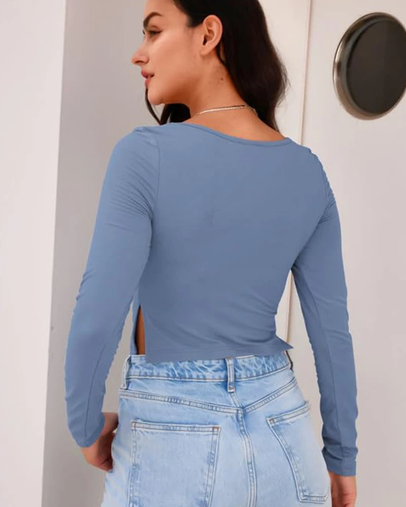 Sexy Side Slit Crop Top for Curvy Women Long Sleeve square Neck Slim Tight Casual Matching Mature Solid Colour Crop Short Top