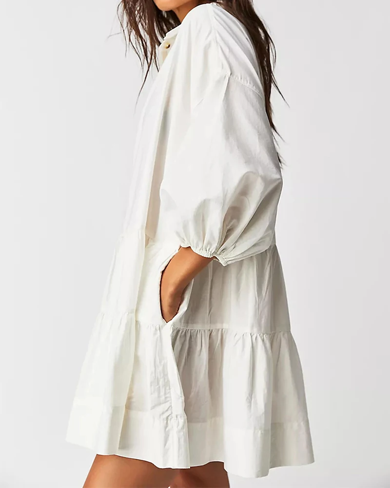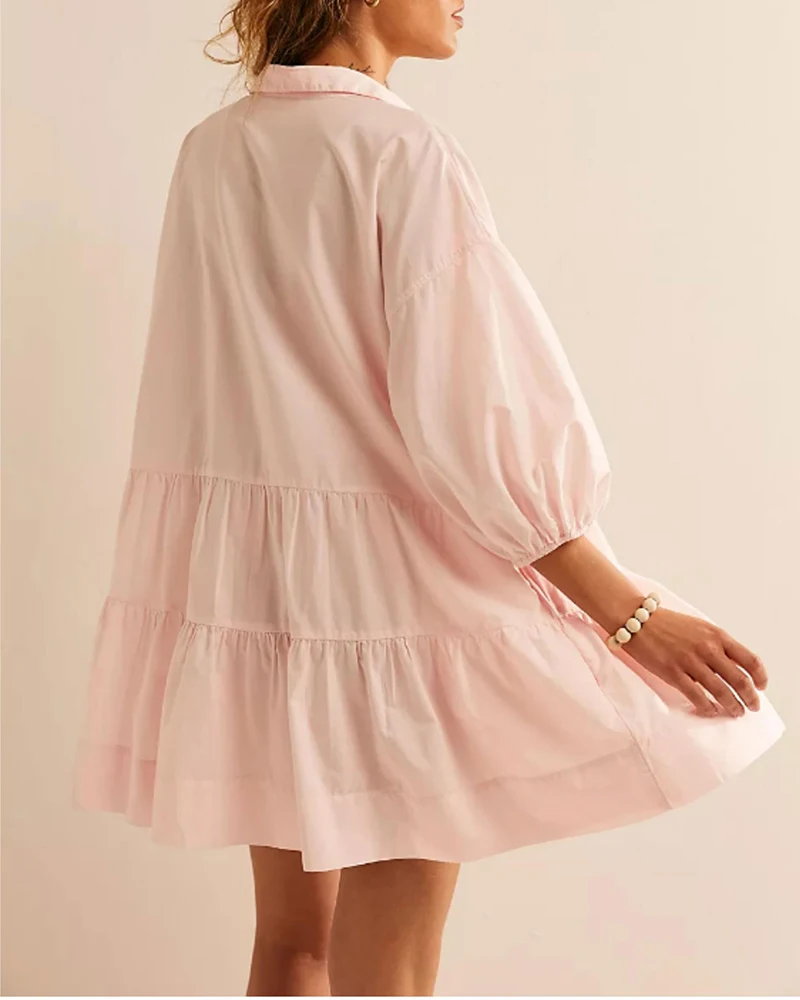 New Style Streetwear Solid Lapel Women's Short Dress Custom Pattern 3/4 Puff Sleeve Swing Babydoll Loose Patchwork Mini Dress
