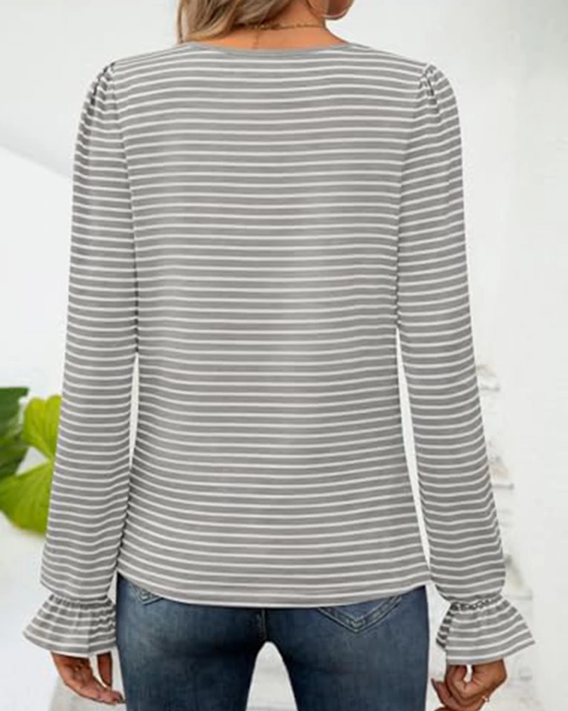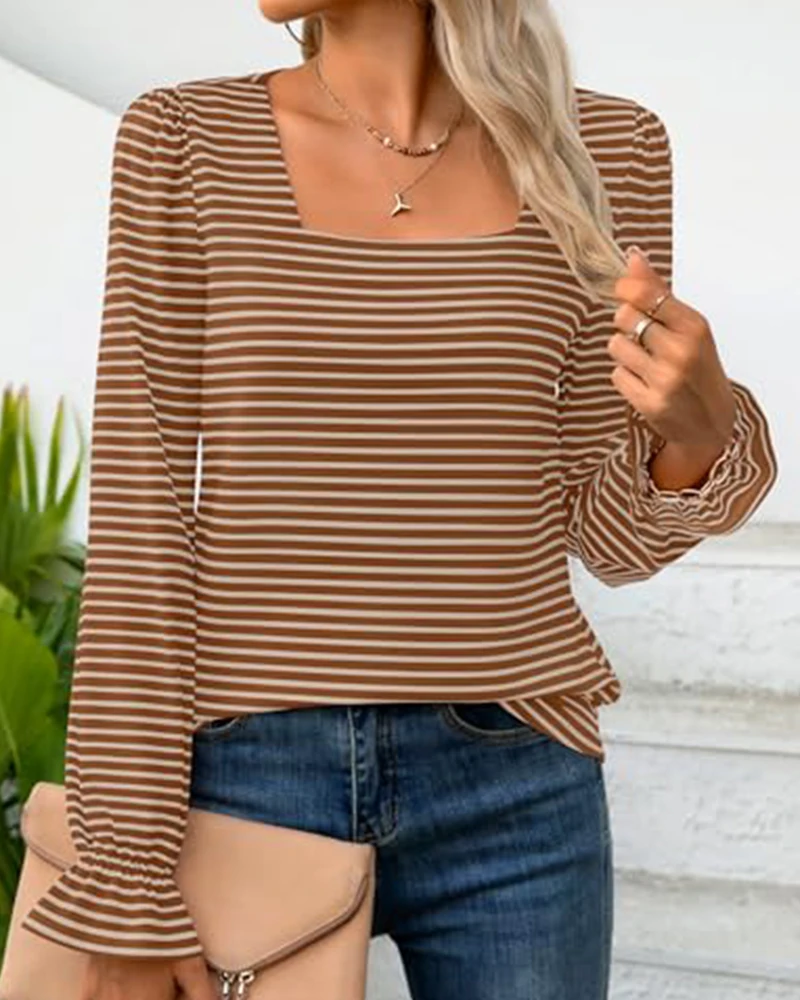 Nice Fall Casual Daily Wearing Top Classical Simple Striped Printed Square Neck Soft Tunic Custom Printed Thin T Shirt Blouse