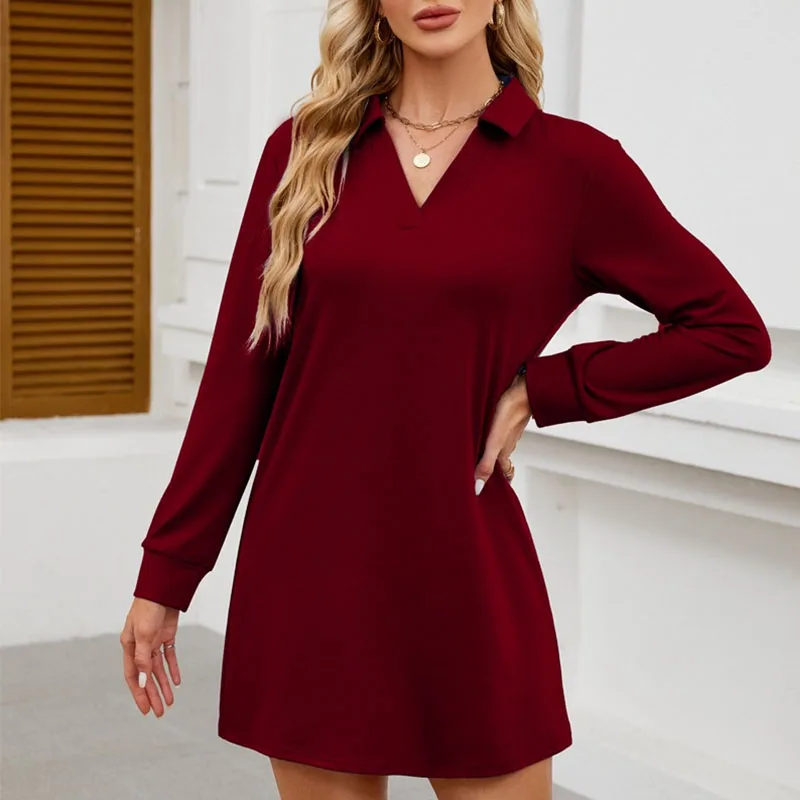 Spring Autumn Winter Sweet Casual Fashion Versatile Solid Color V-neck Women's Long Sleeved Loose Fit Lapel Collar Mini Dress