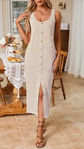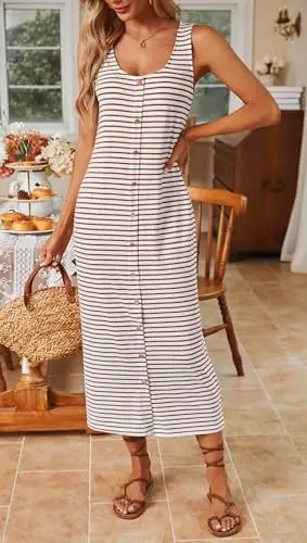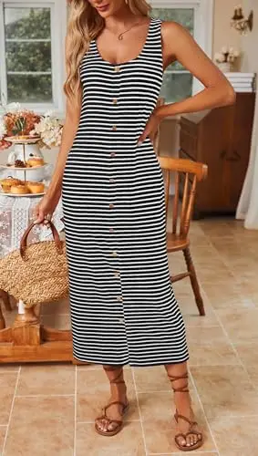 Summer New Striped U Neck Button Design Elegant Long Dress Women's Comfortable and Softness Knitted Bodycon Sleeveless Dresses
