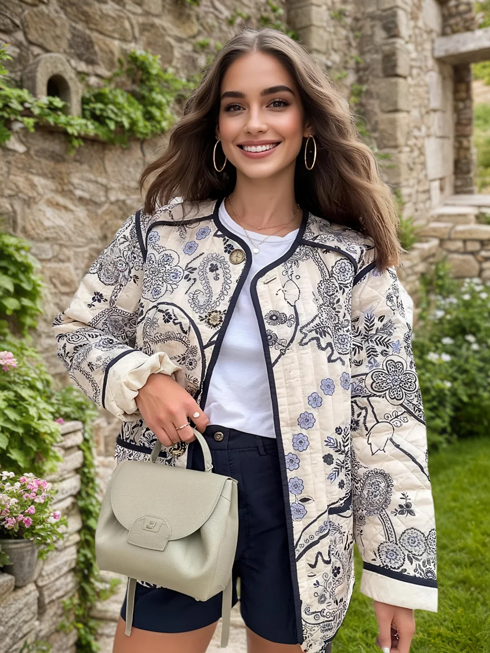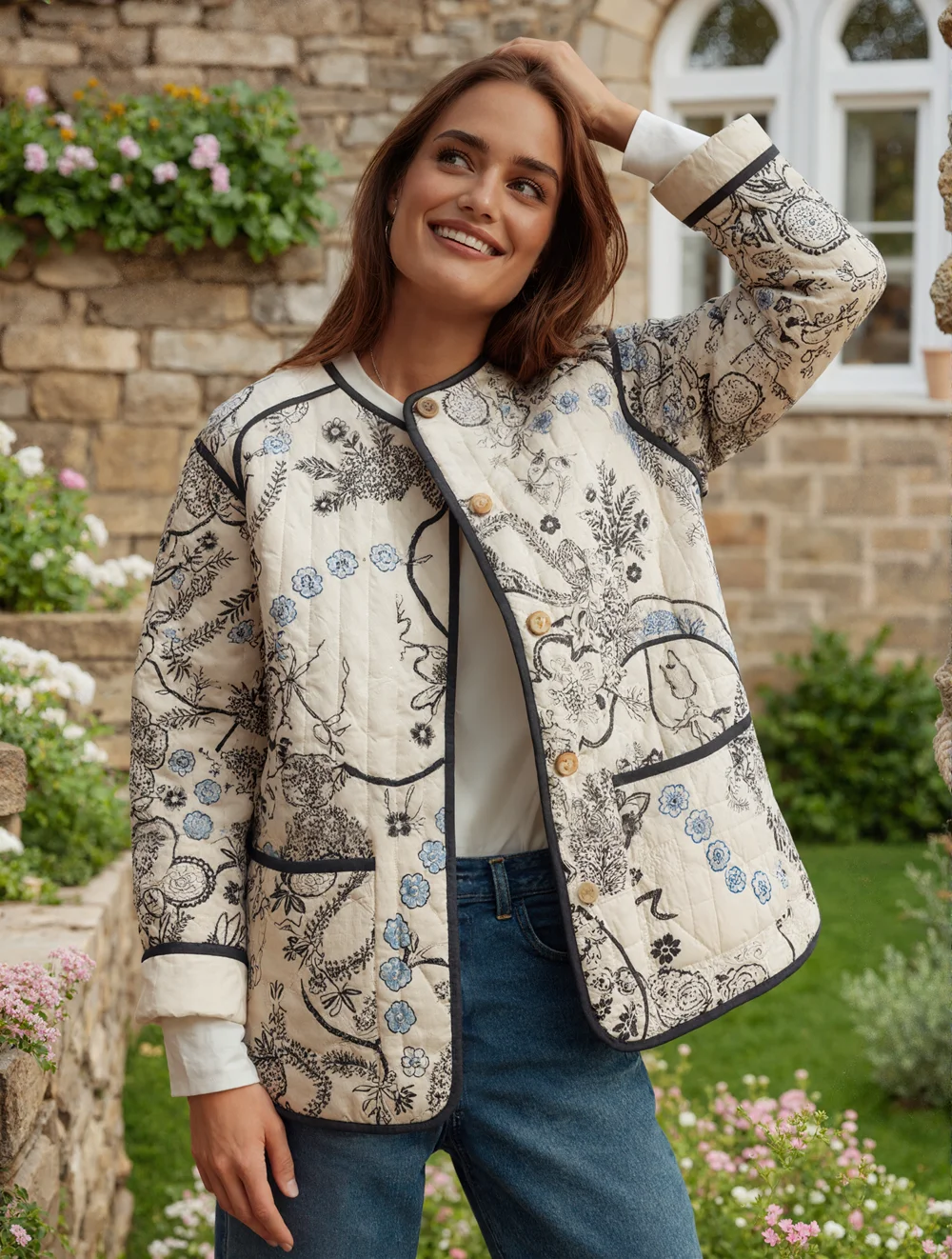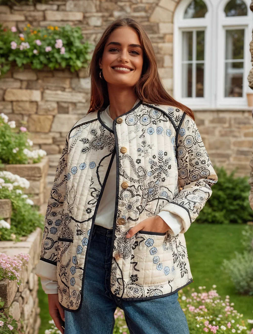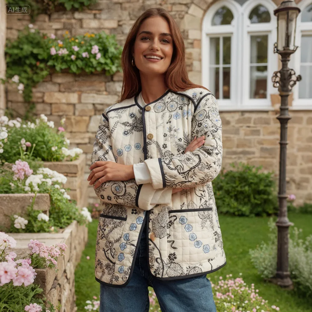 Fall New Arrivals European Women's Streetwear Fashion Long-Sleeve Printed Quilted Cotton Jacket Floral Vintage Coat