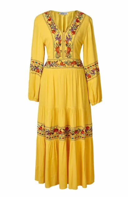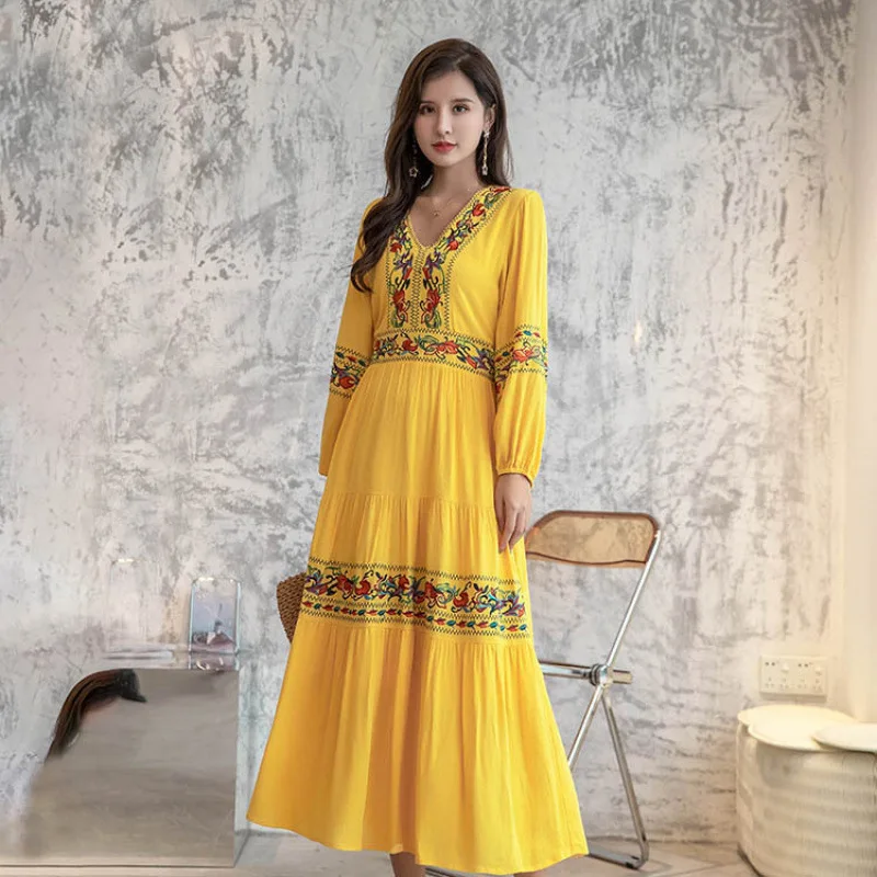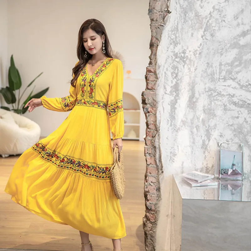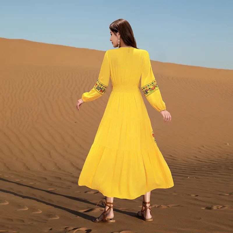 Women's Summer Empire Waist Retro V-neck A-line Skirt Long Dress New Style Democratic Style Ancient City Photo Waist-cinching