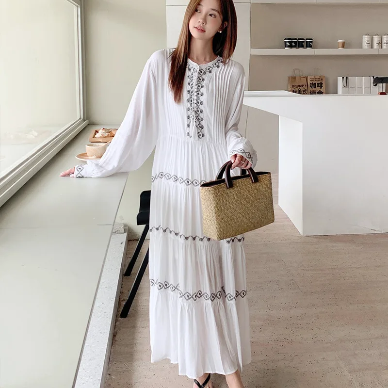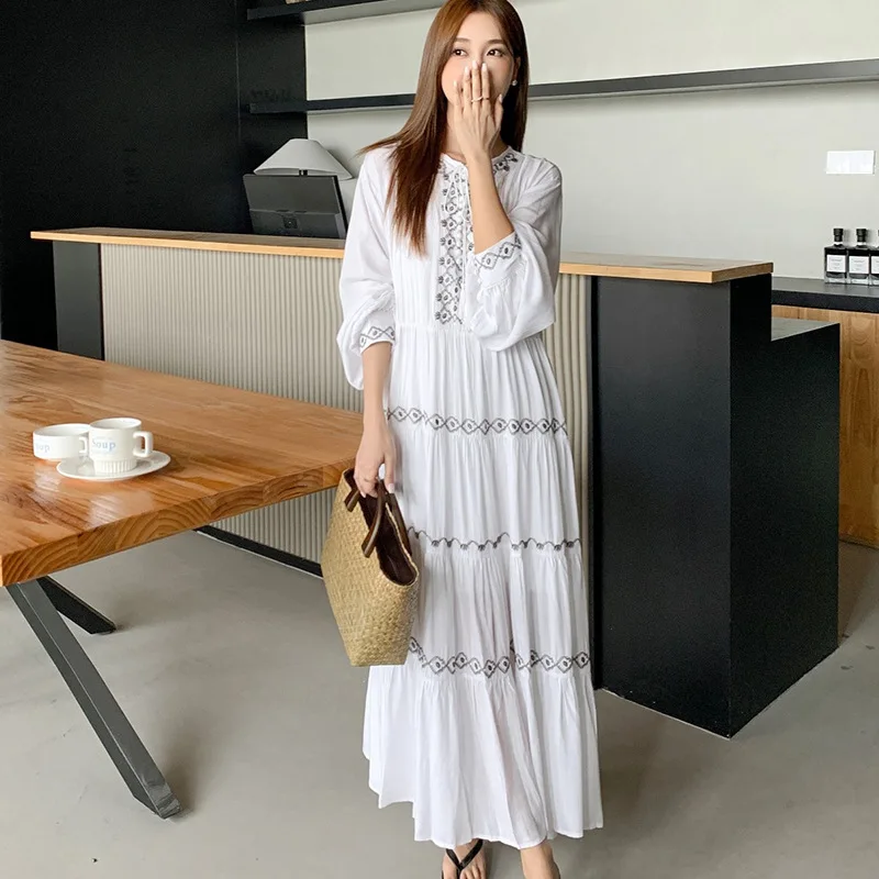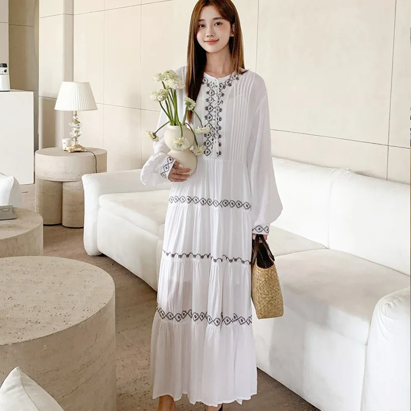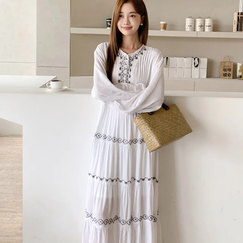 2026 SimpleNew Arrival White Dress French-Style Dress with V-Neck and Cinched Waist Minimalist Slimming Long Dress