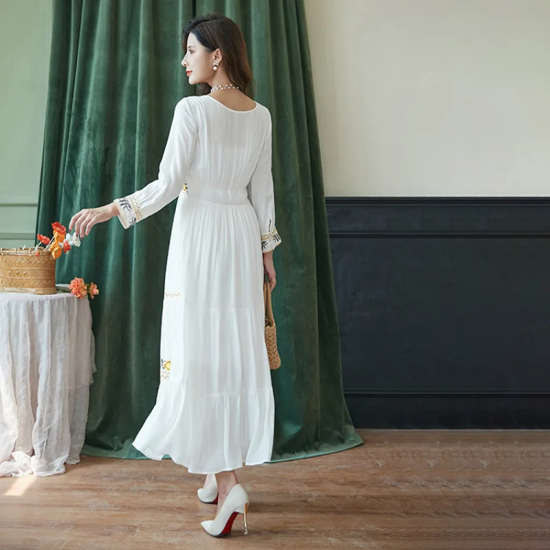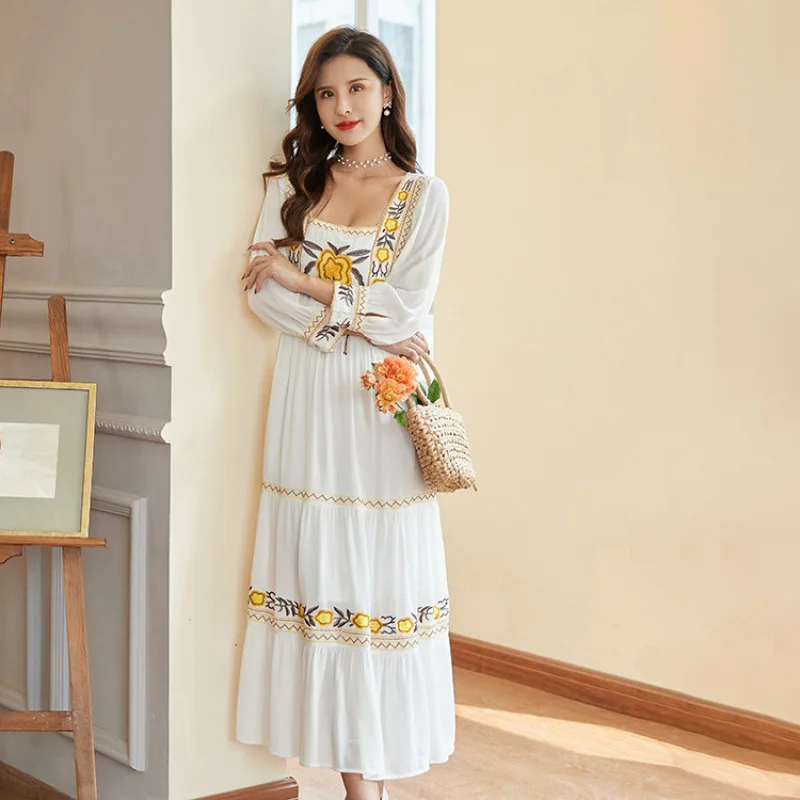 2026 New Elegant Bohemian Embroidered French Dress with Square Neckline and Full Skirt Midi Resort Vintage Dress