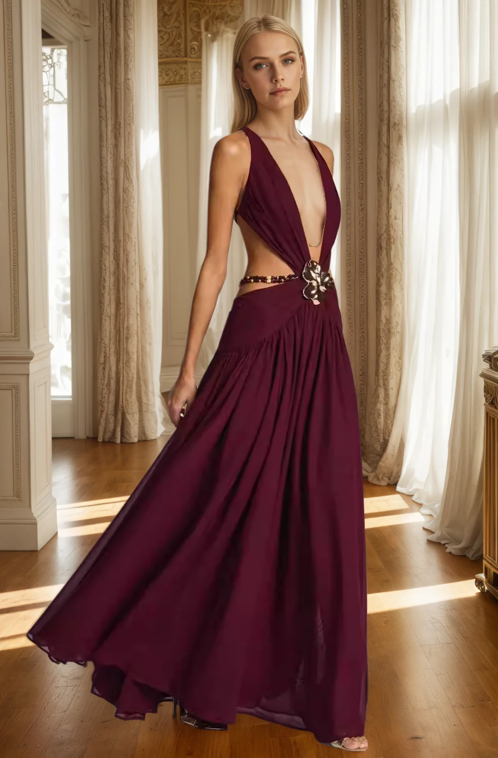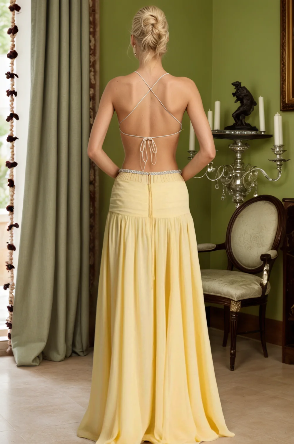 Fashionable Dress with Hanging Neck Deep V-strap Sexy High Slit Metal Decoration Backless Yellow Maxi Dress