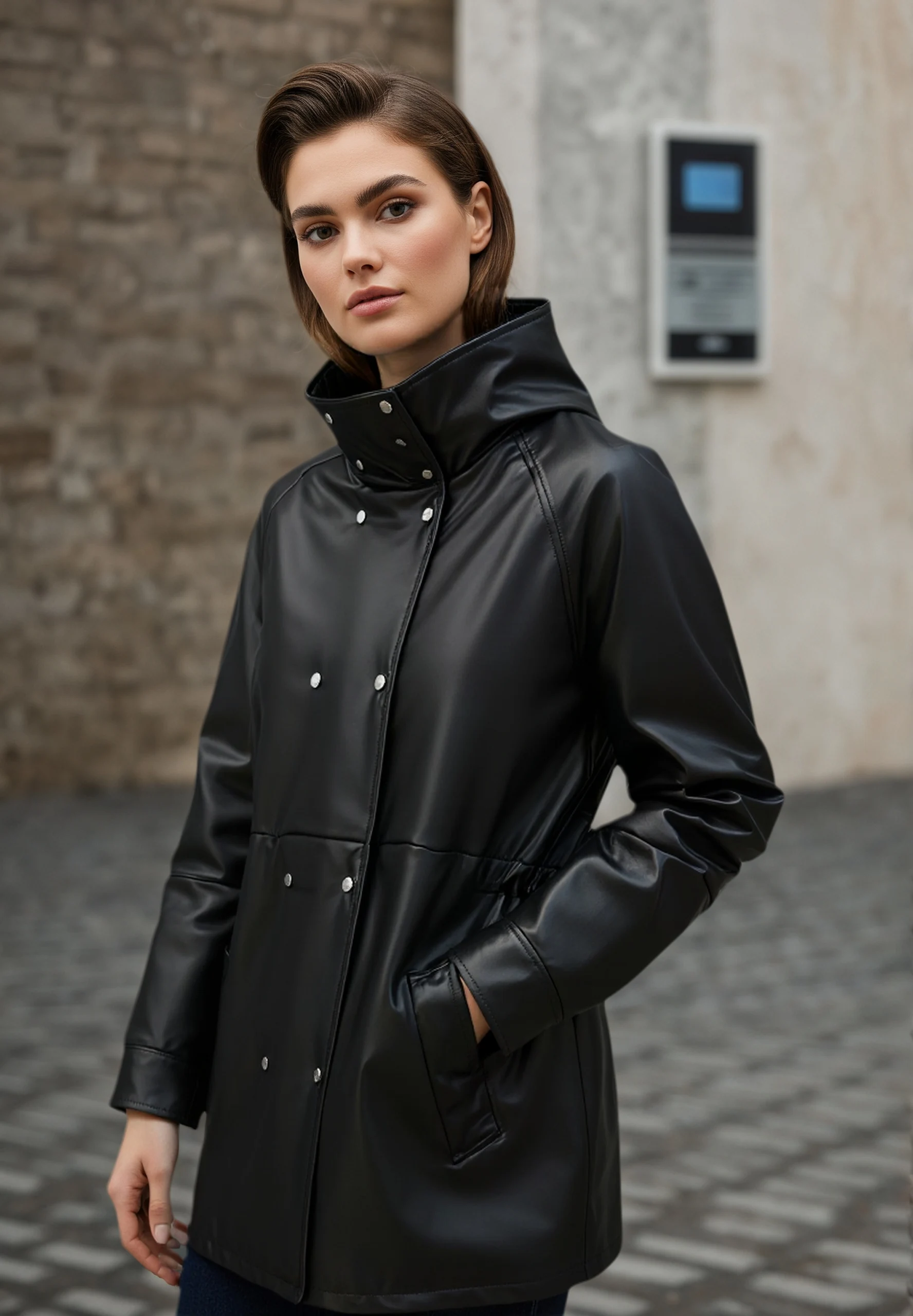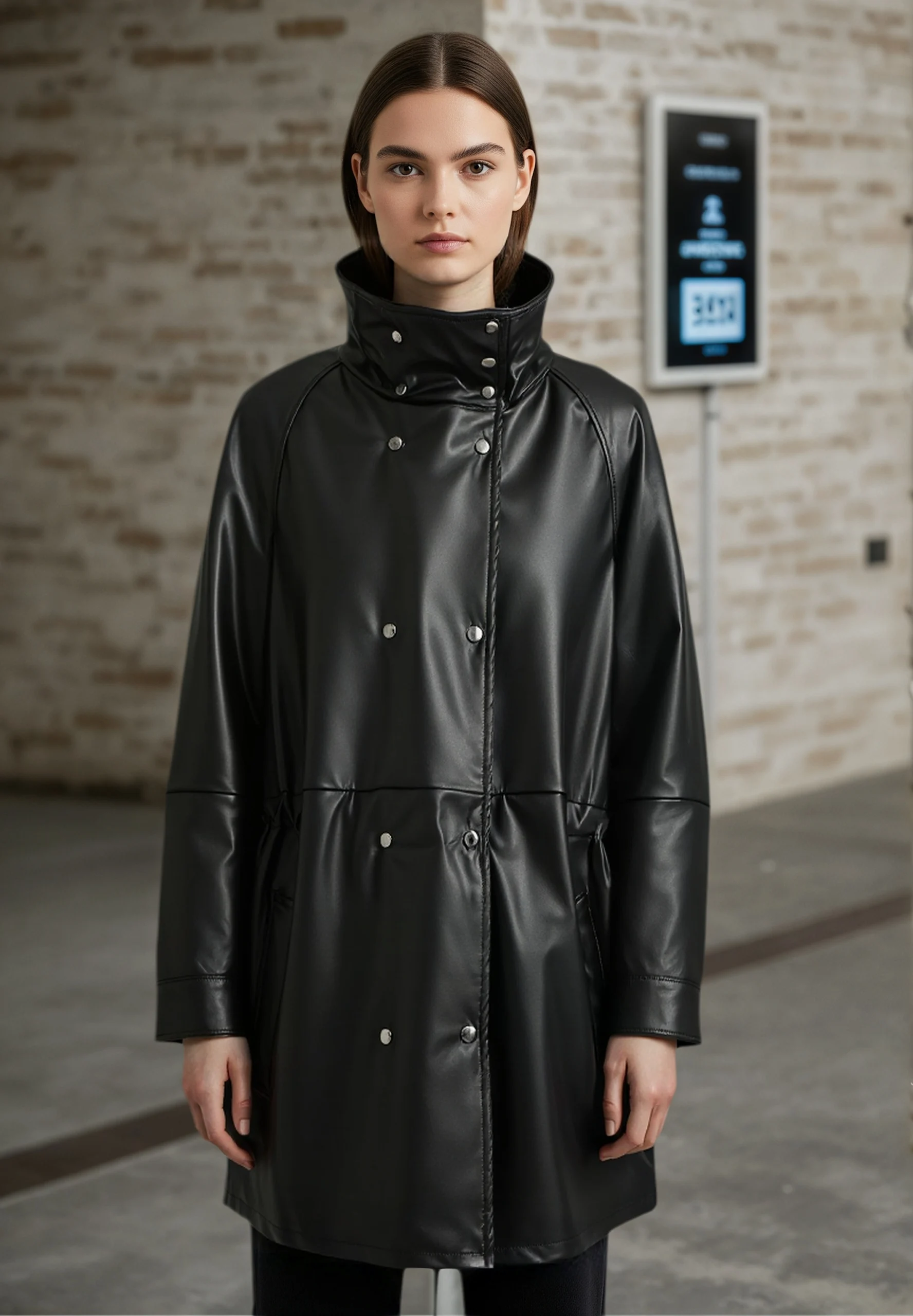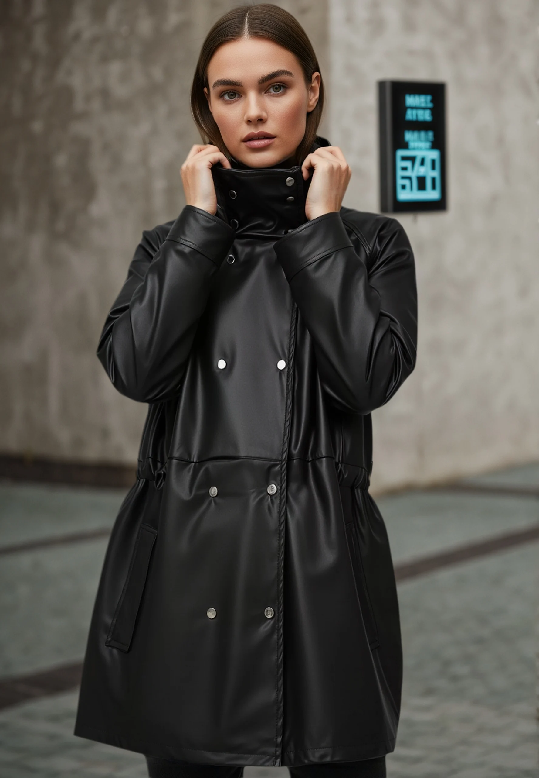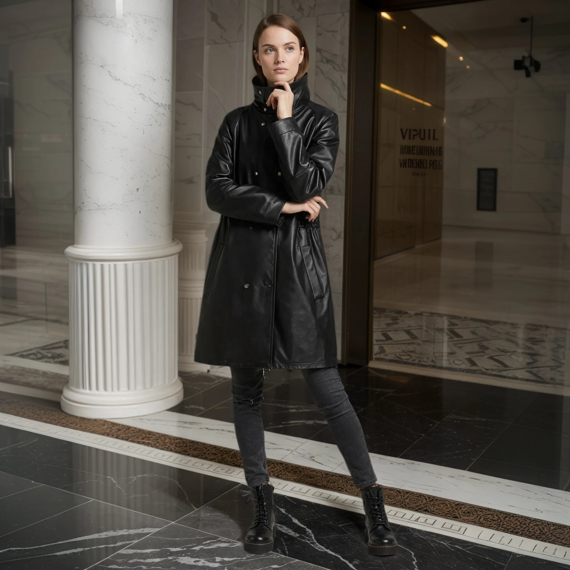 Autumn/Winter Drawstring Waist Fashionable Faux Leather Slim Fit Coat Retro Double-Breasted Stand Collar Casual Women's Jacket