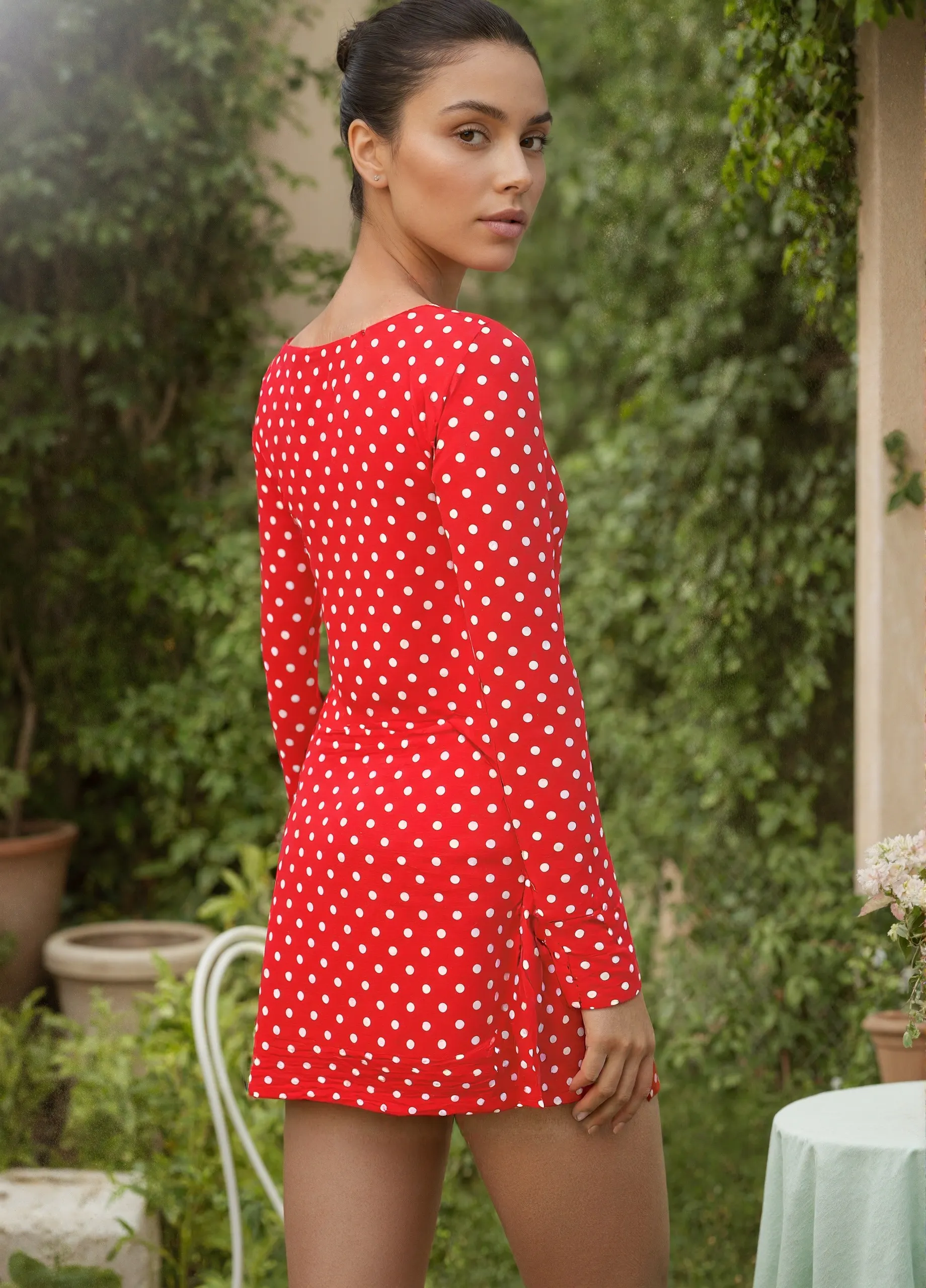 Red Color Polka Dot Print Dress v Neck Lace up Long Sleeve Casual Fashion Mini Dresses for Women