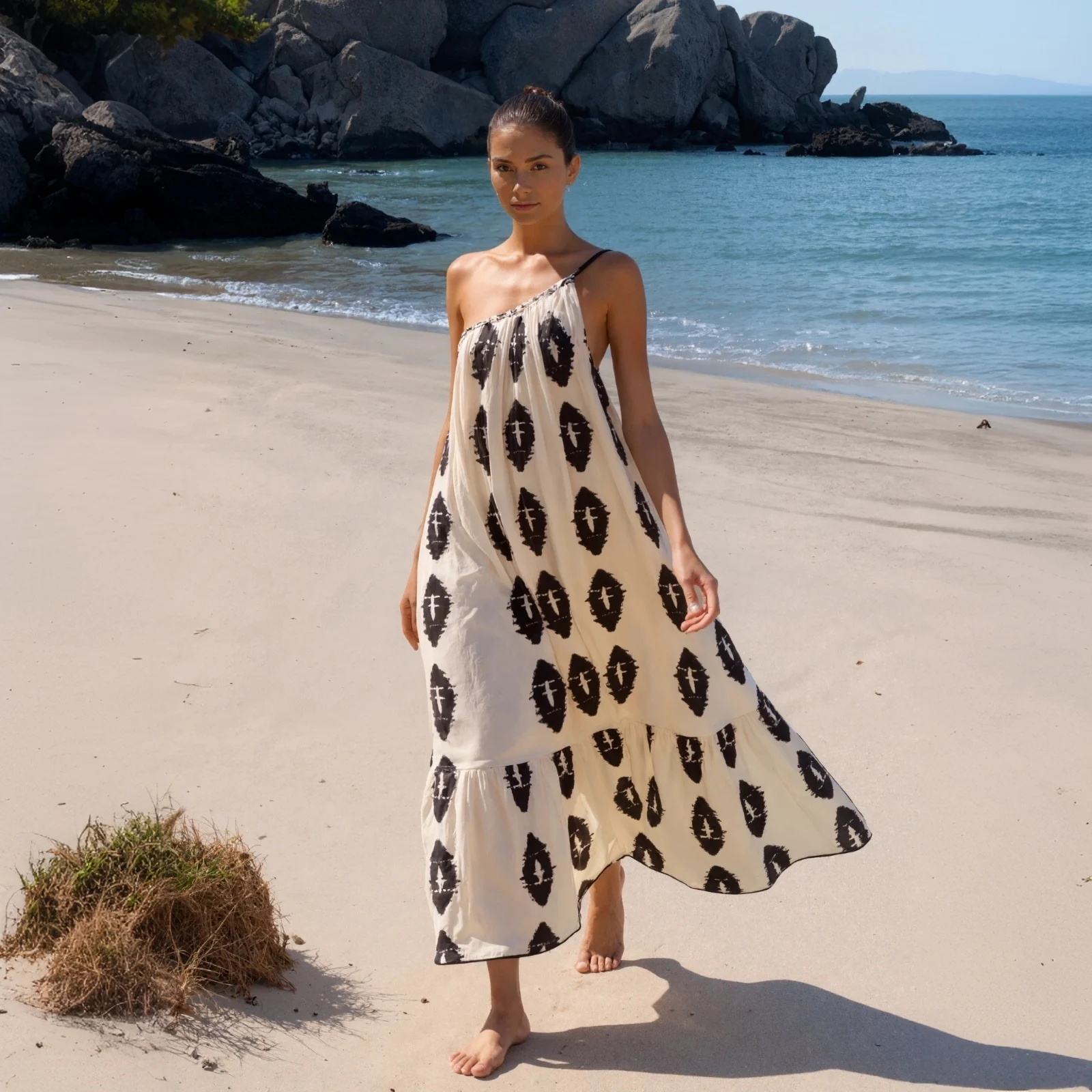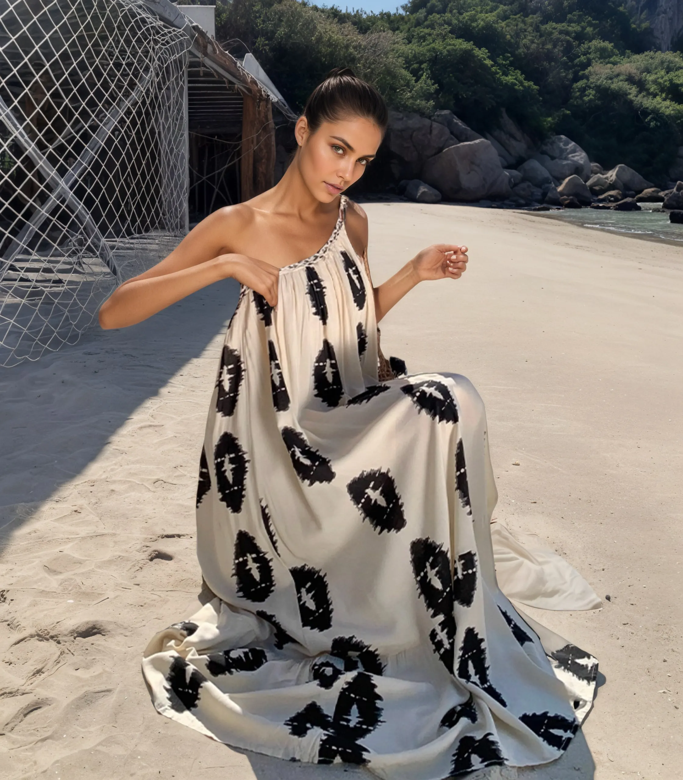 2026 Spring New Women's Sexy Off Shoulder Long Asymmetric Midi Dress Summer Fashion French Beach Loose Printed Dress