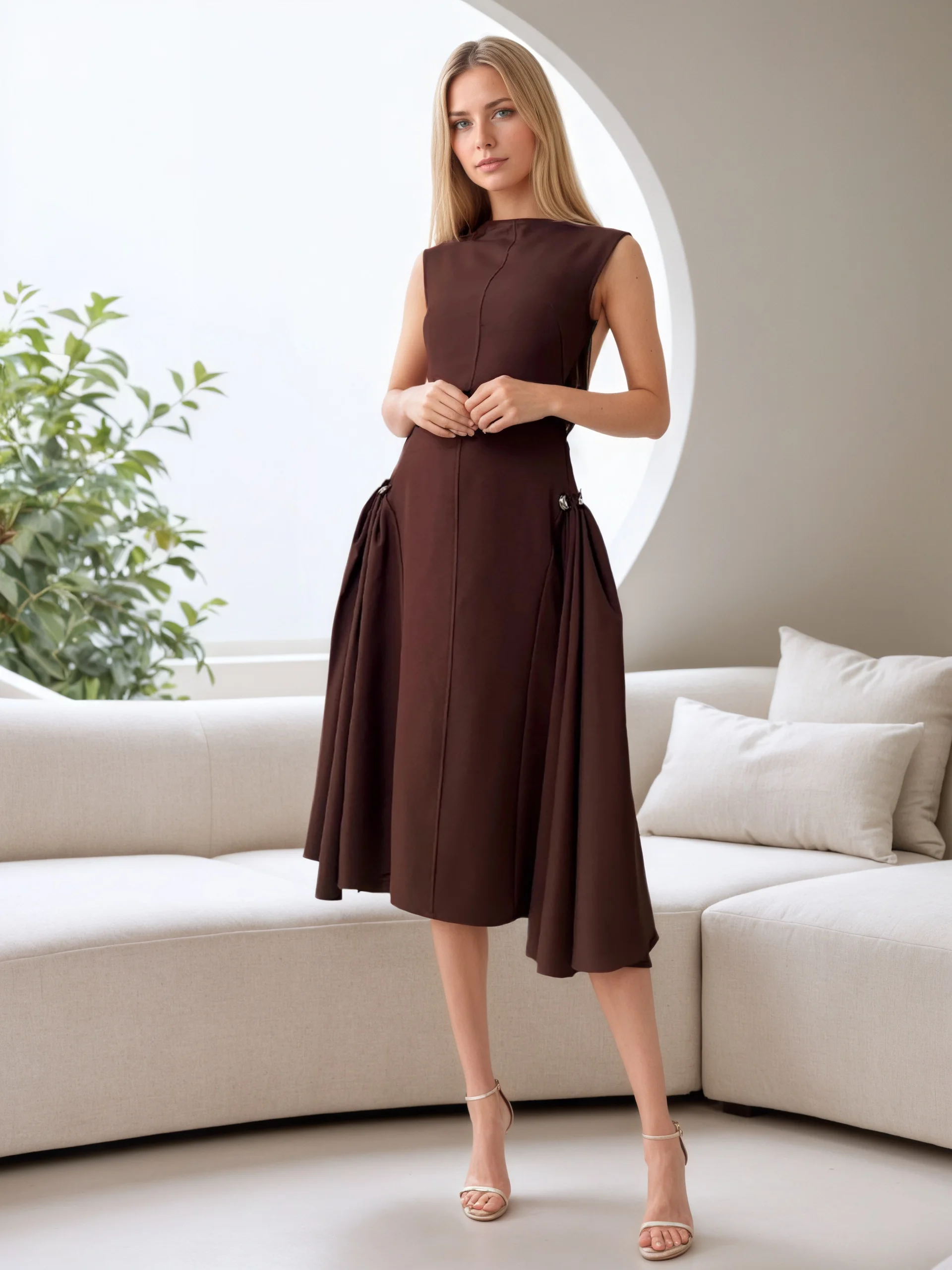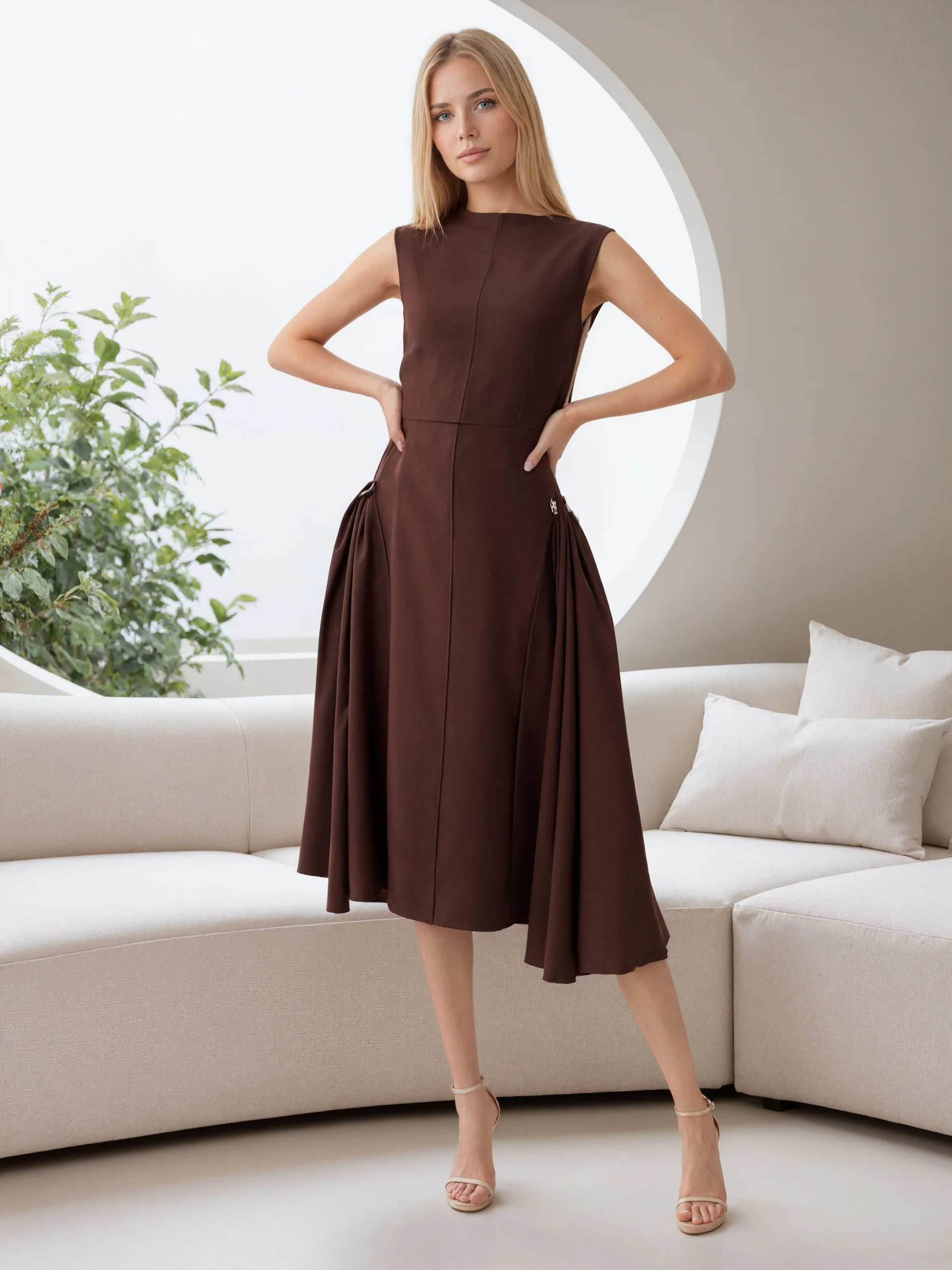 Women 2026 Premium Solid Spring New Fashion Half High Neck Big Pleated Dress Vintage Sleeveless Female Dresses