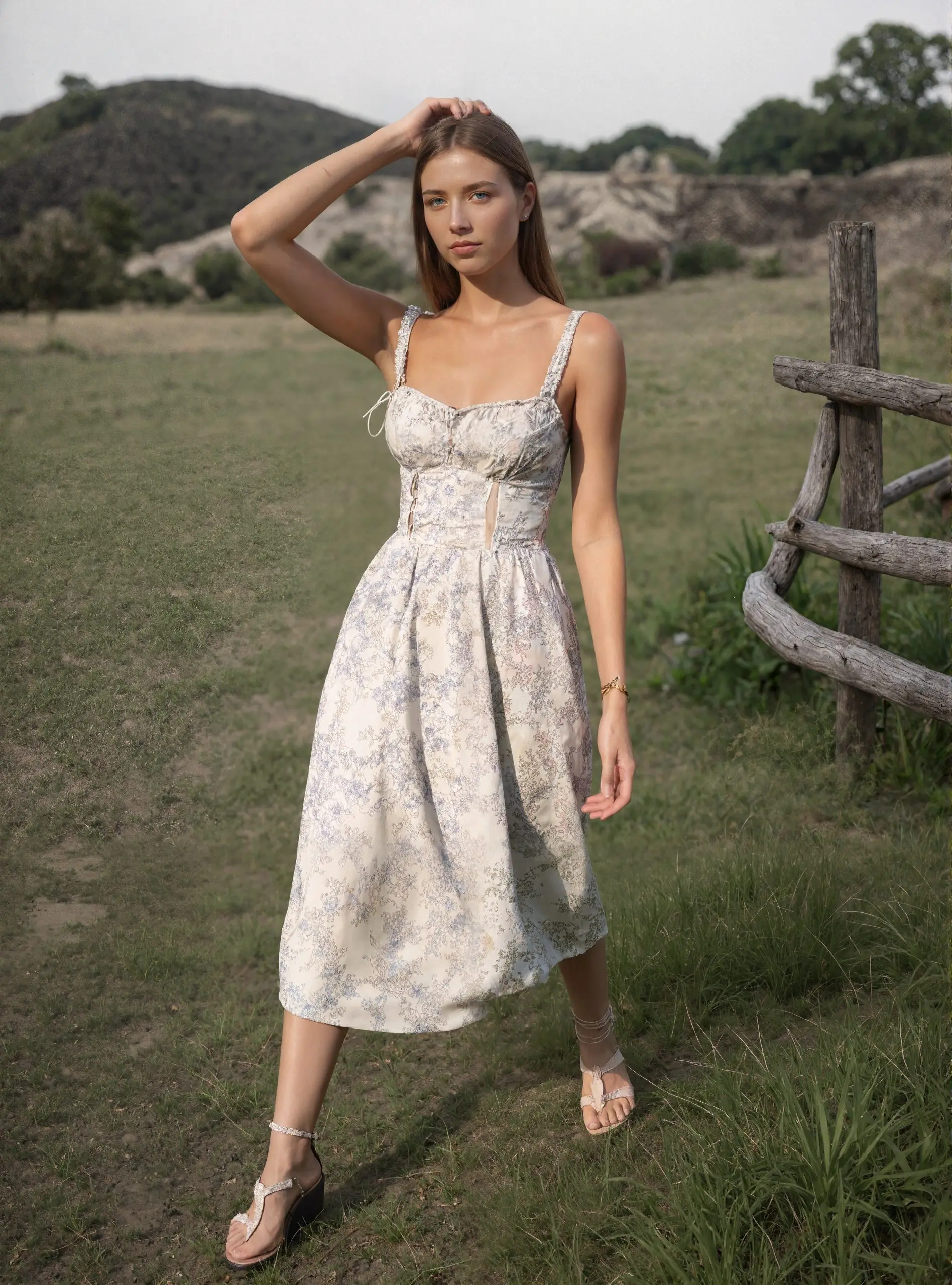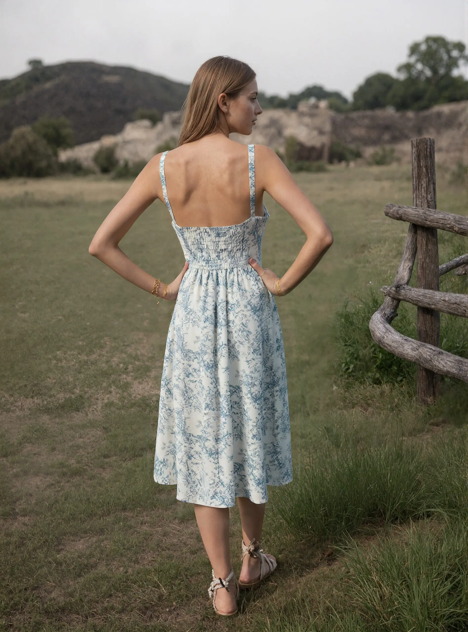 Floral Print Blue White Color Front Lace up Spaghetti Strap Casual Fashion Summer Simple Dress for Ladies