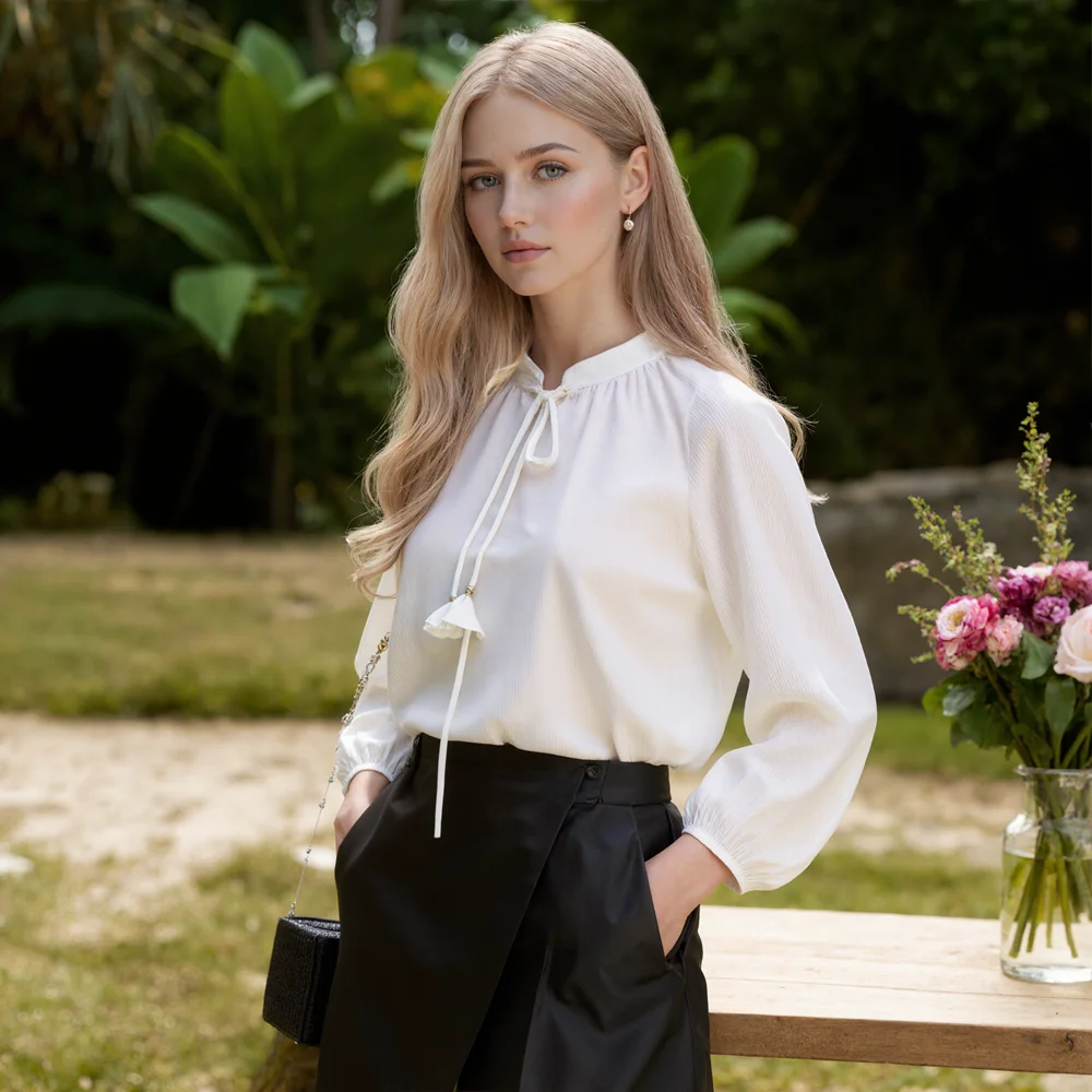 Women's Elegant Casual Dobby Chiffon Crinkle Long Sleeve Lyocell Blouse Woven Top with Tassels for Summer ODM Supply