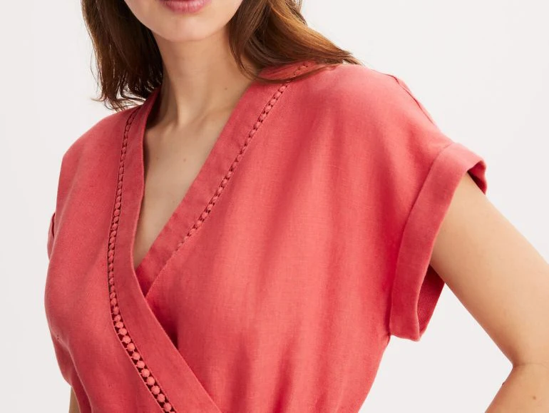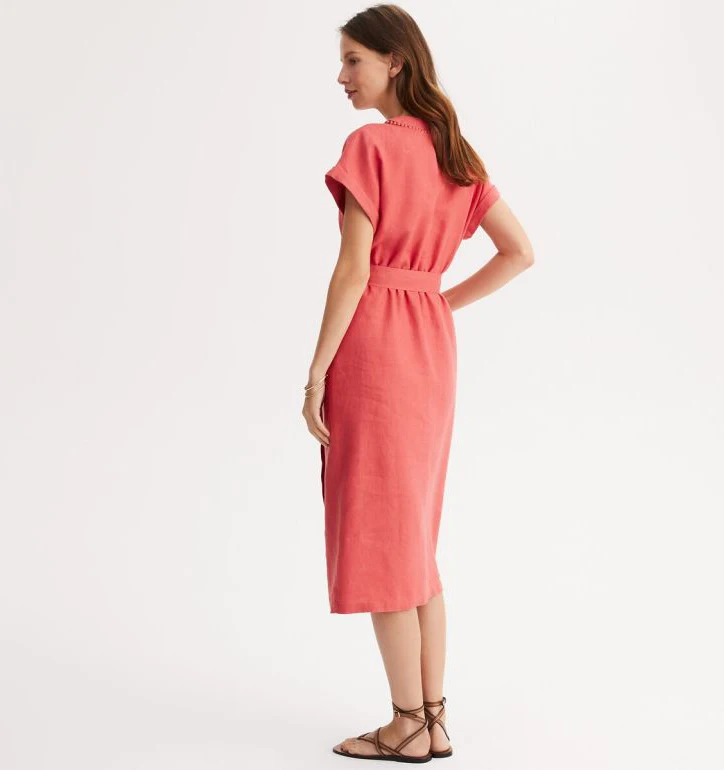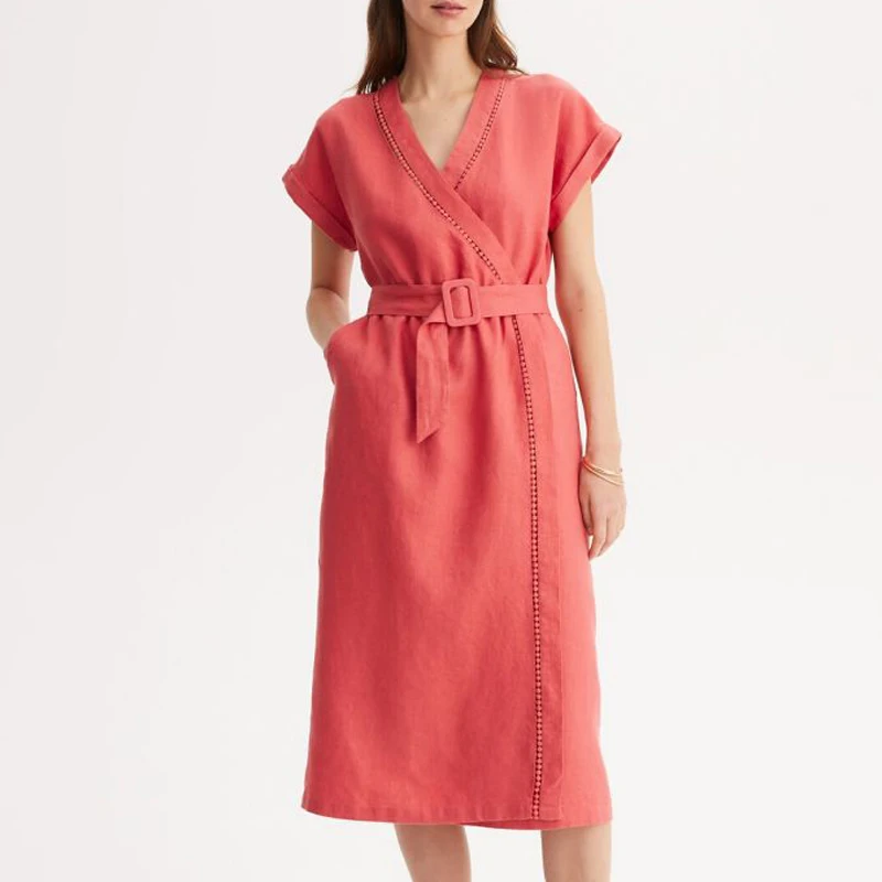 Custom Clothing Women's 100% Linen Knee-Length Dresses Embroidery Short Sleeve Women Ladies Solid Color Dress