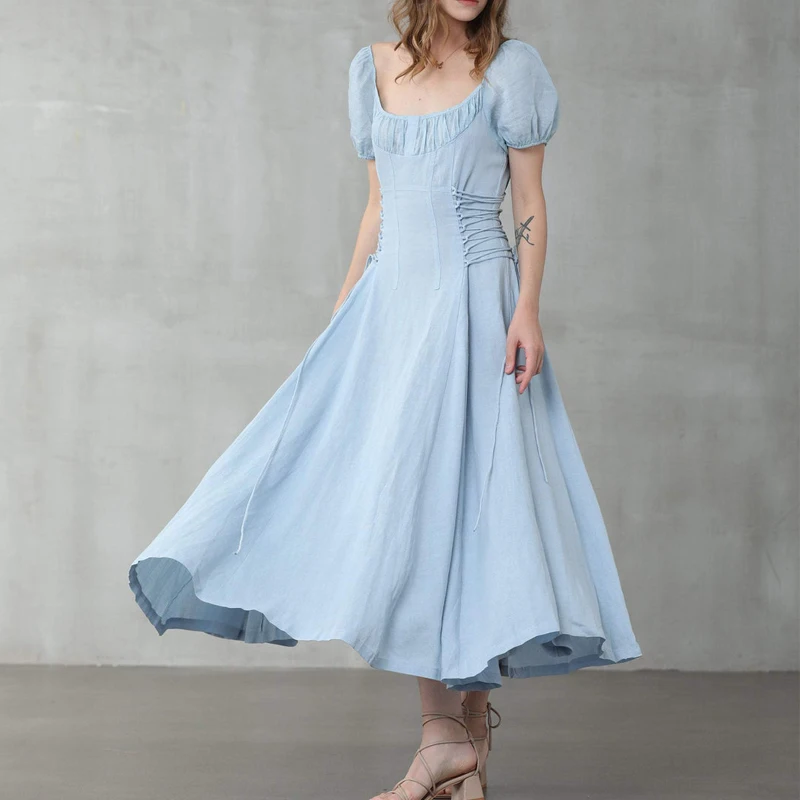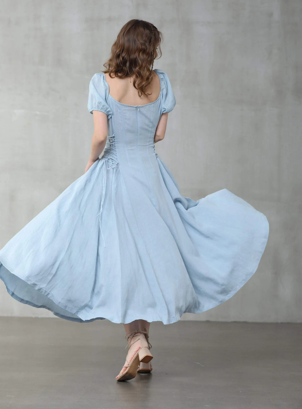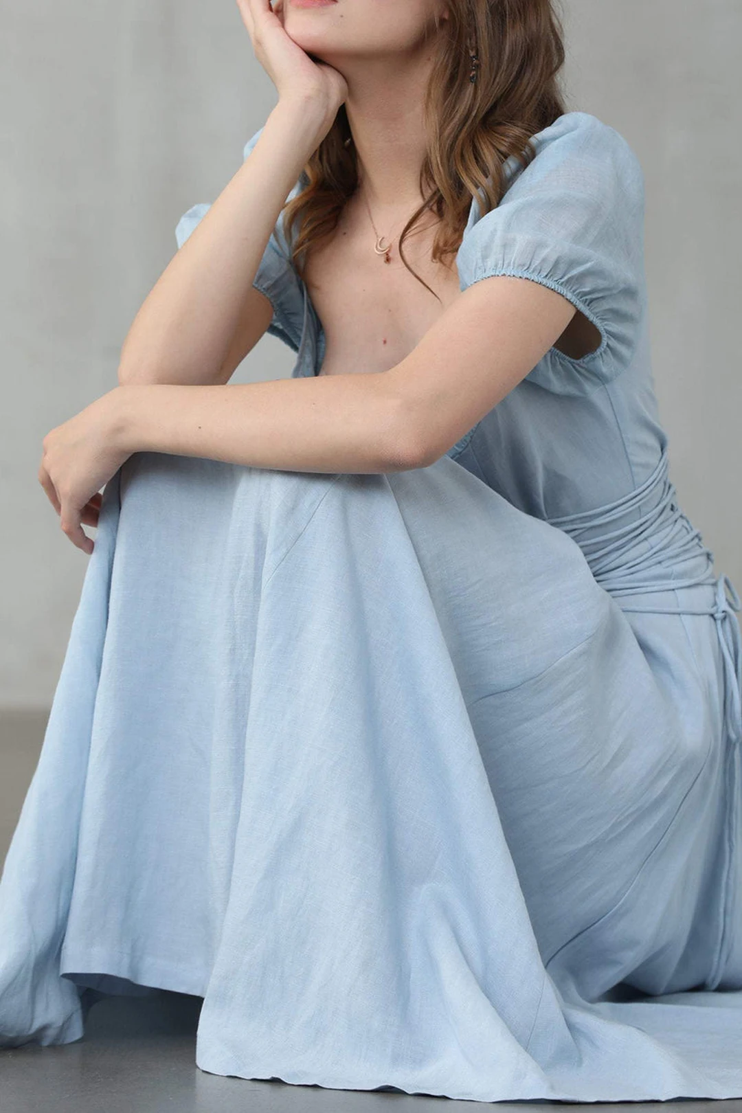 Vintage Long Dress Custom Handmade Linen Gown Short Puff Sleeved Linen Dress Elegant Summer Maxi Dress for Women