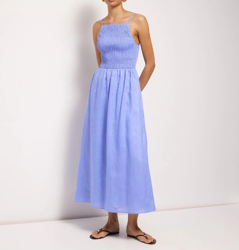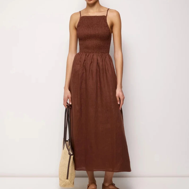 Custom Clothing Ladies New Summer Pleated Elegant Midi Dress Side Pockets Spaghetti Straps Linen Cotton Dress for Women