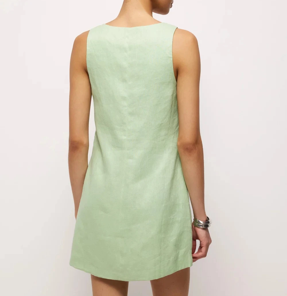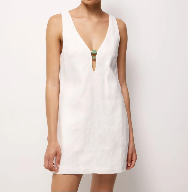 Customized Clothes Women's High Quality V Neck Cutout Sleeveless Resin Trim Shift Mini Dress Simple Minimalist Linen Dress