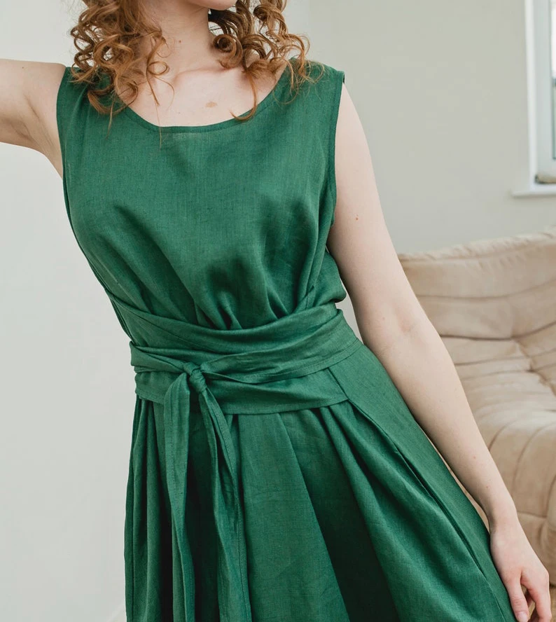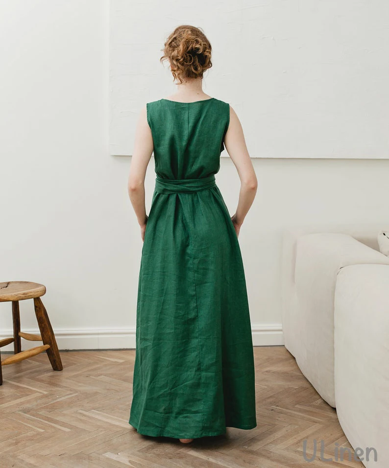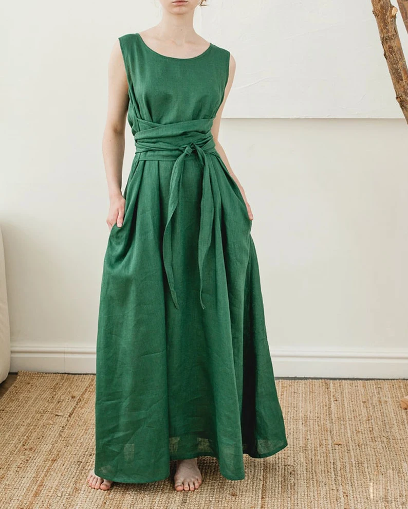 Customized Made European Pure Linen Clothing Fashion Dress Women's 100% Linen Wrap Dress Sleeveless Waist Straps Long Dress