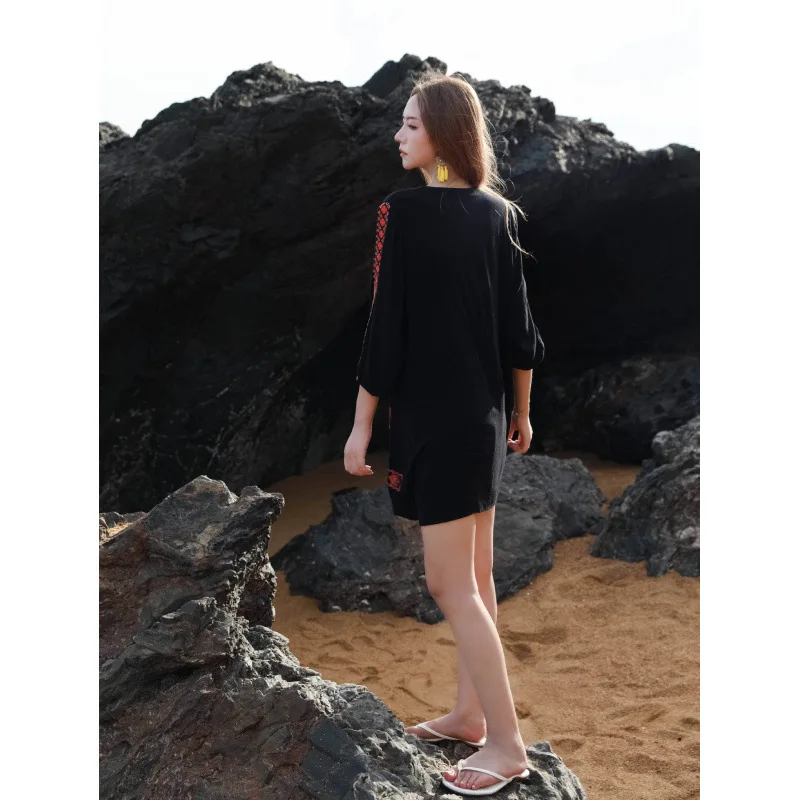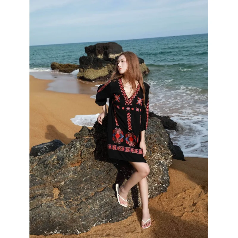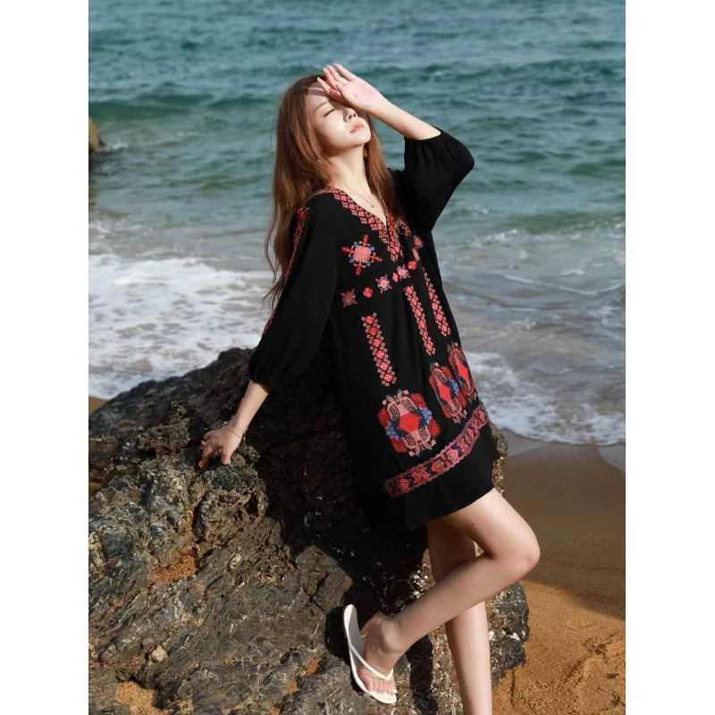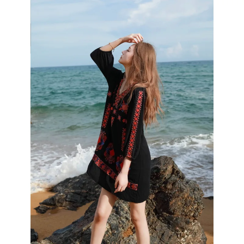 Travel Clothes Red V-Neck Embroidered Cotton Vintage Anti-Static Dress Autumn New Ethnic Age-Reducing Short Mini Loose Dress