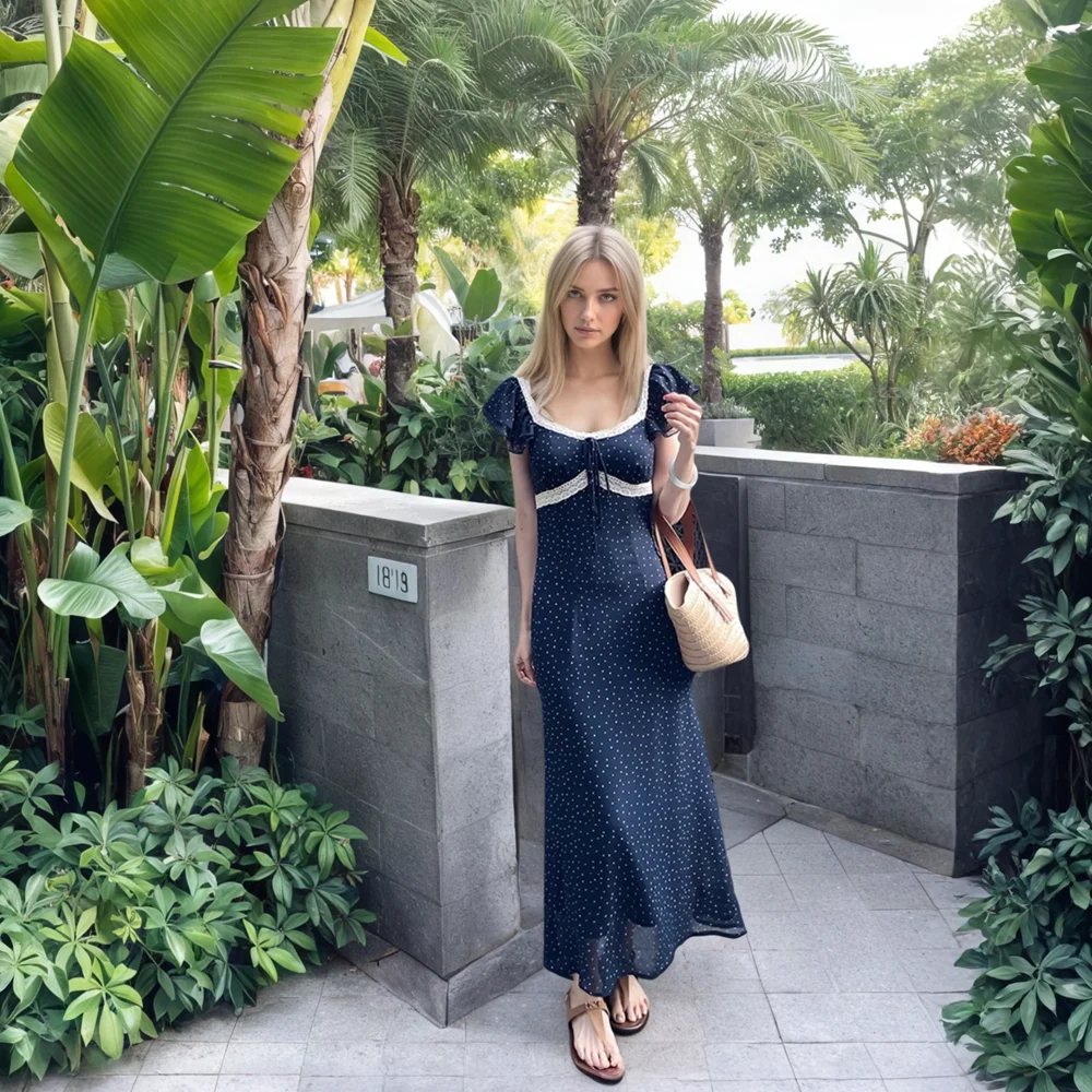 Fitted Polka Dot Midi Dress Neckline Slimming Lace Trim Fashionable New Patchwork Dress Ladies France Style Casual Dress