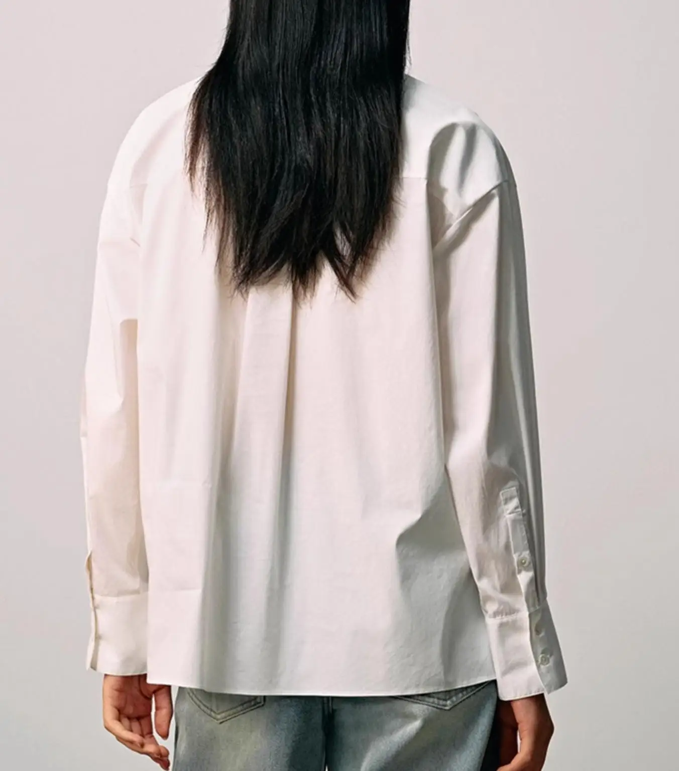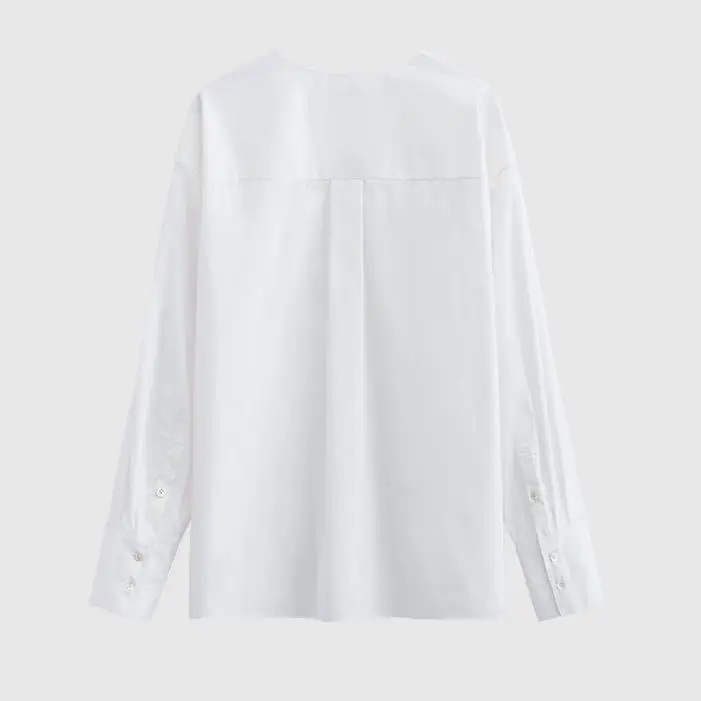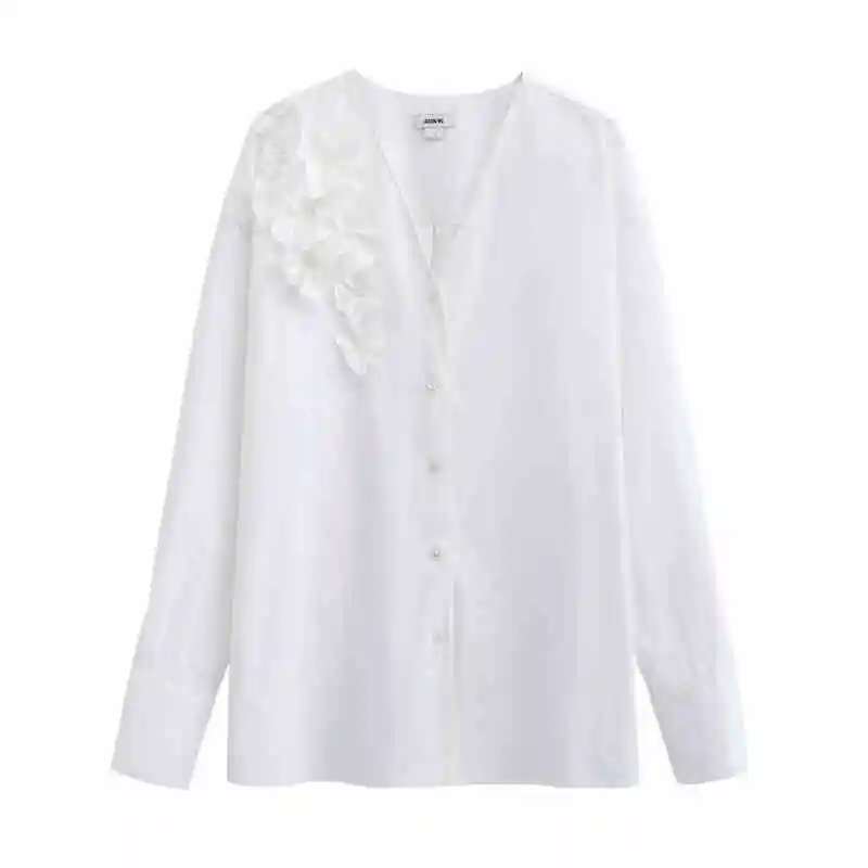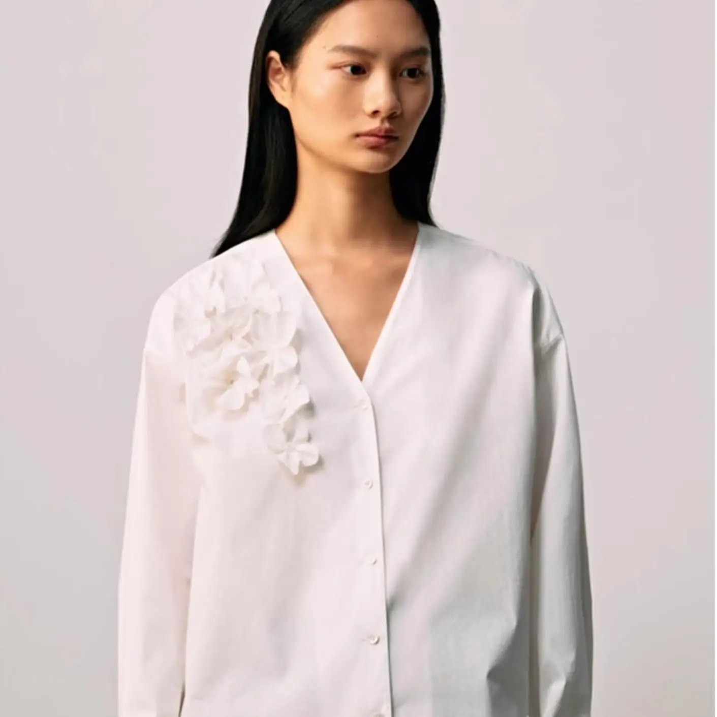 Autumn New Style V Neck Shirt Chic Casual Simple Shirt Flower Decoration White Long-sleeved Lapel Shirt