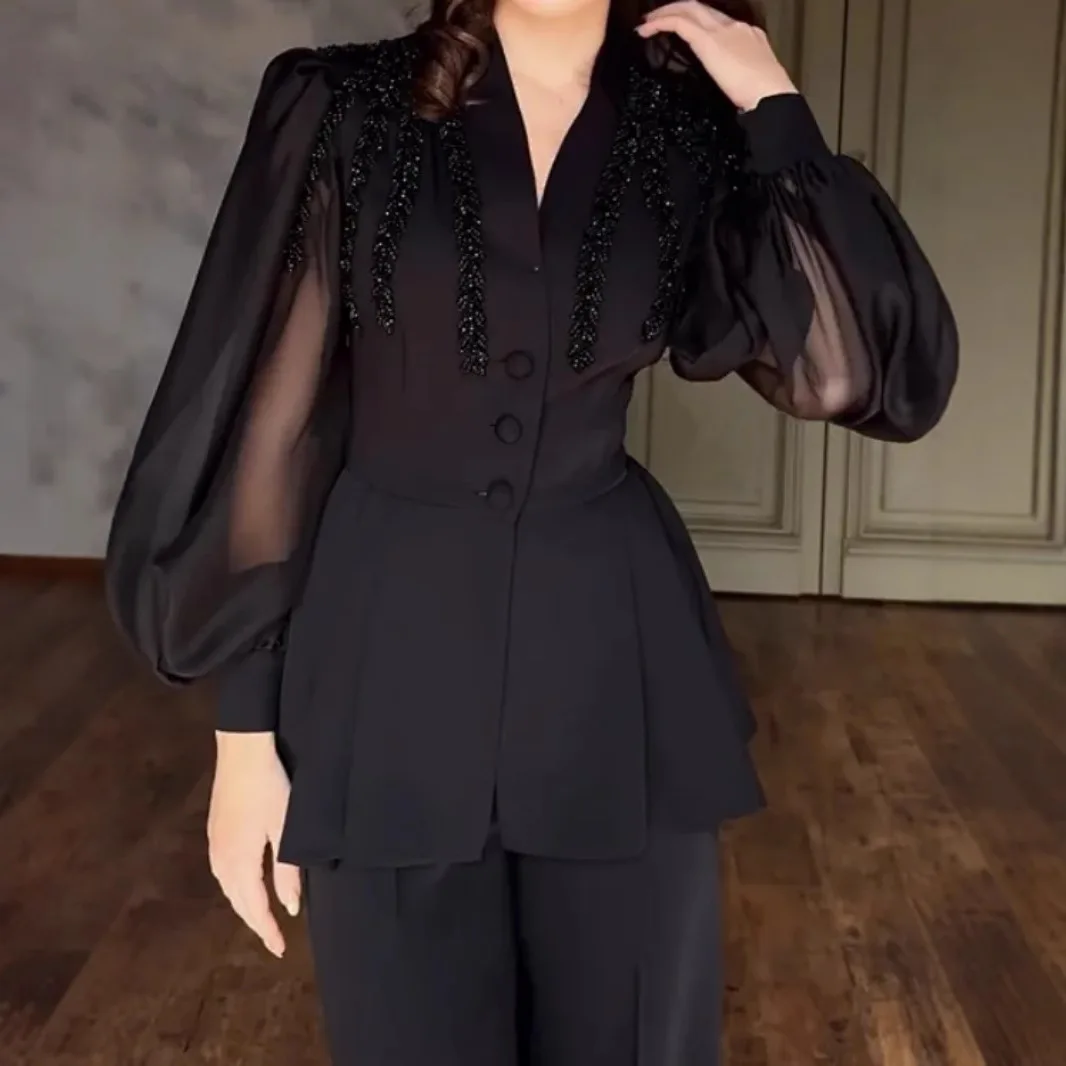 Fashion V-neck Retro Slim Fit Sexy Black Shirt Pants Women 2 Pieces Set Puff Sleeve Blazer Blazer and Flared Trousers Suits