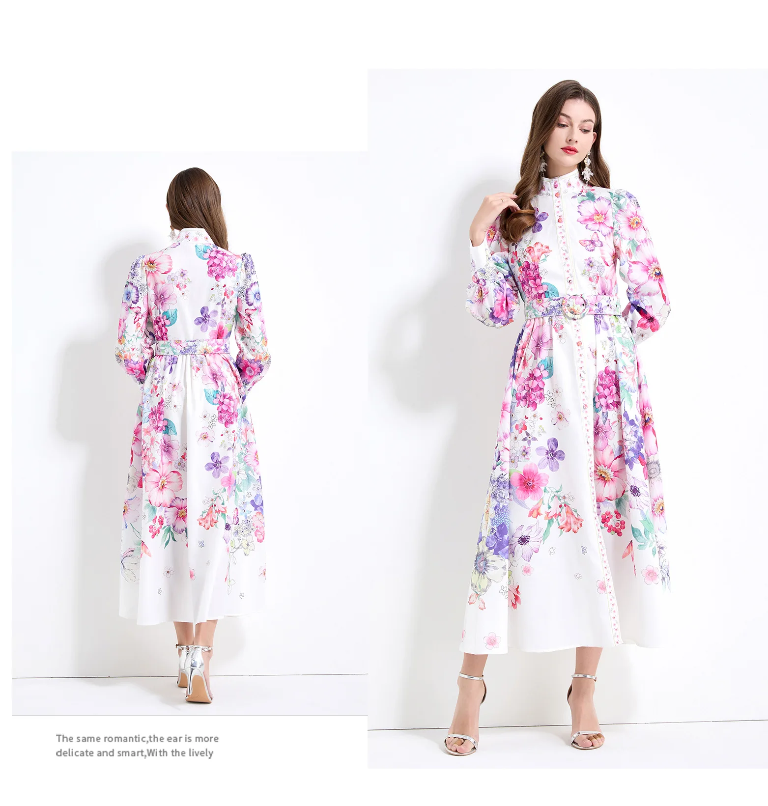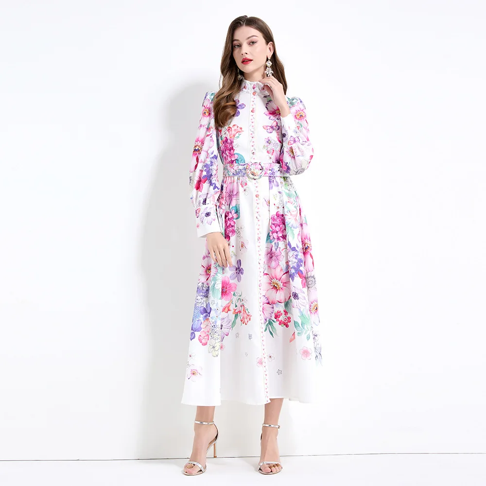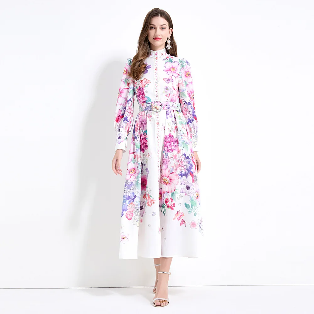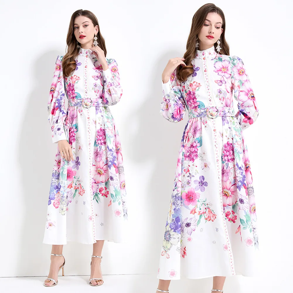 Vintage Stand Collar Printed Long Skirt Women European and American Elegant Dress