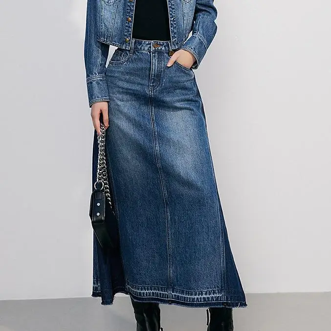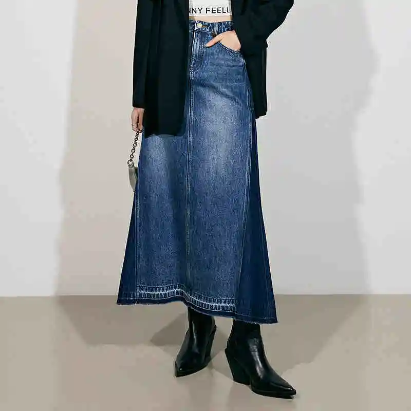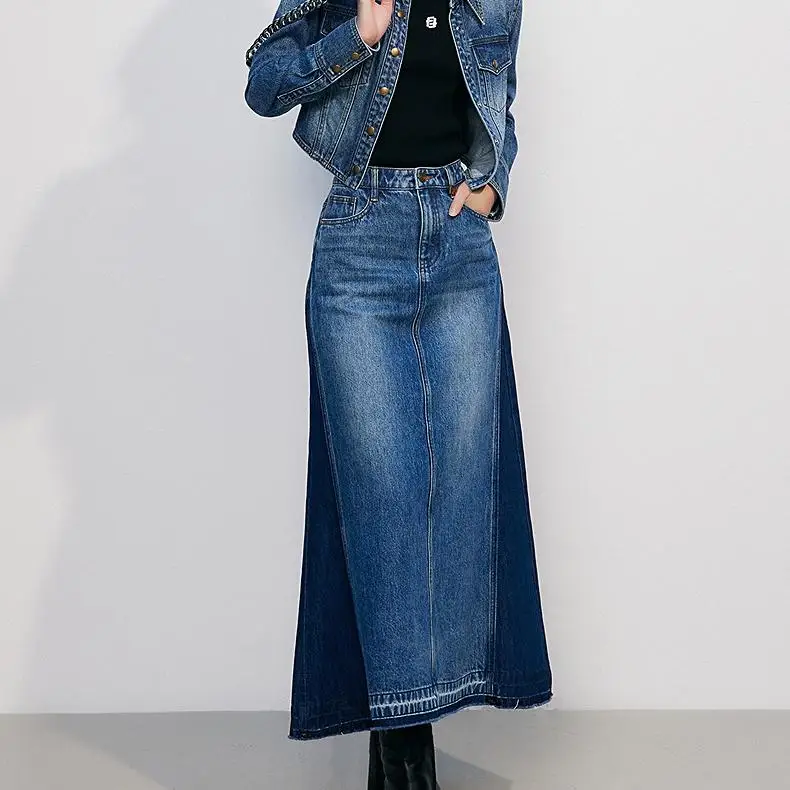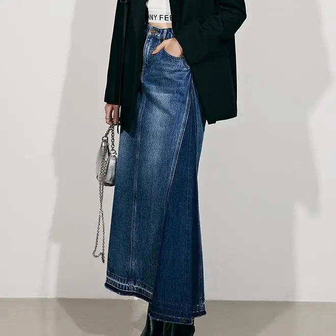 Summer High Waist Big Hem A-line Tassels Skirts Fashion Long Maxi Jean Skirts for Women Patchwork Mermaid Dress Denim Skirt