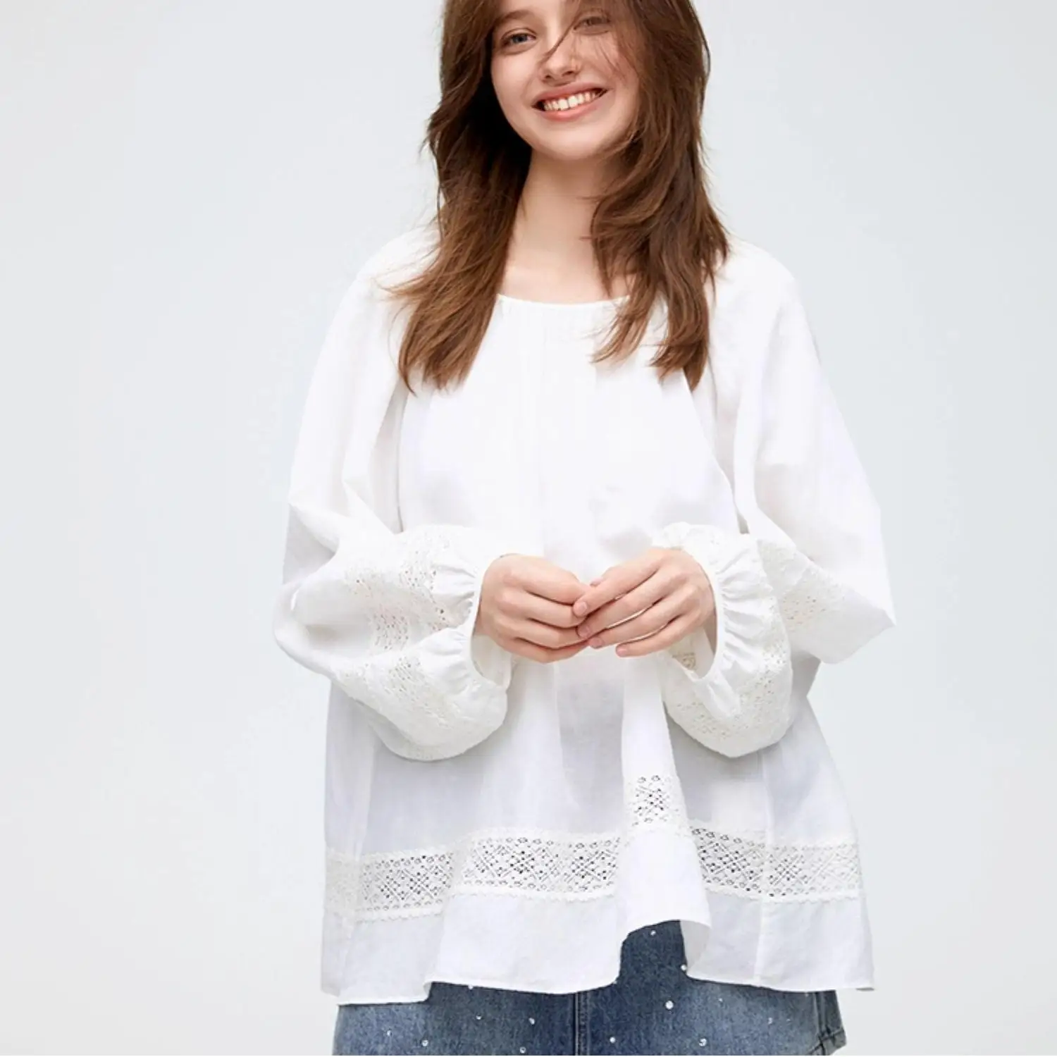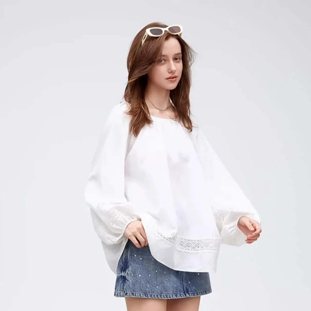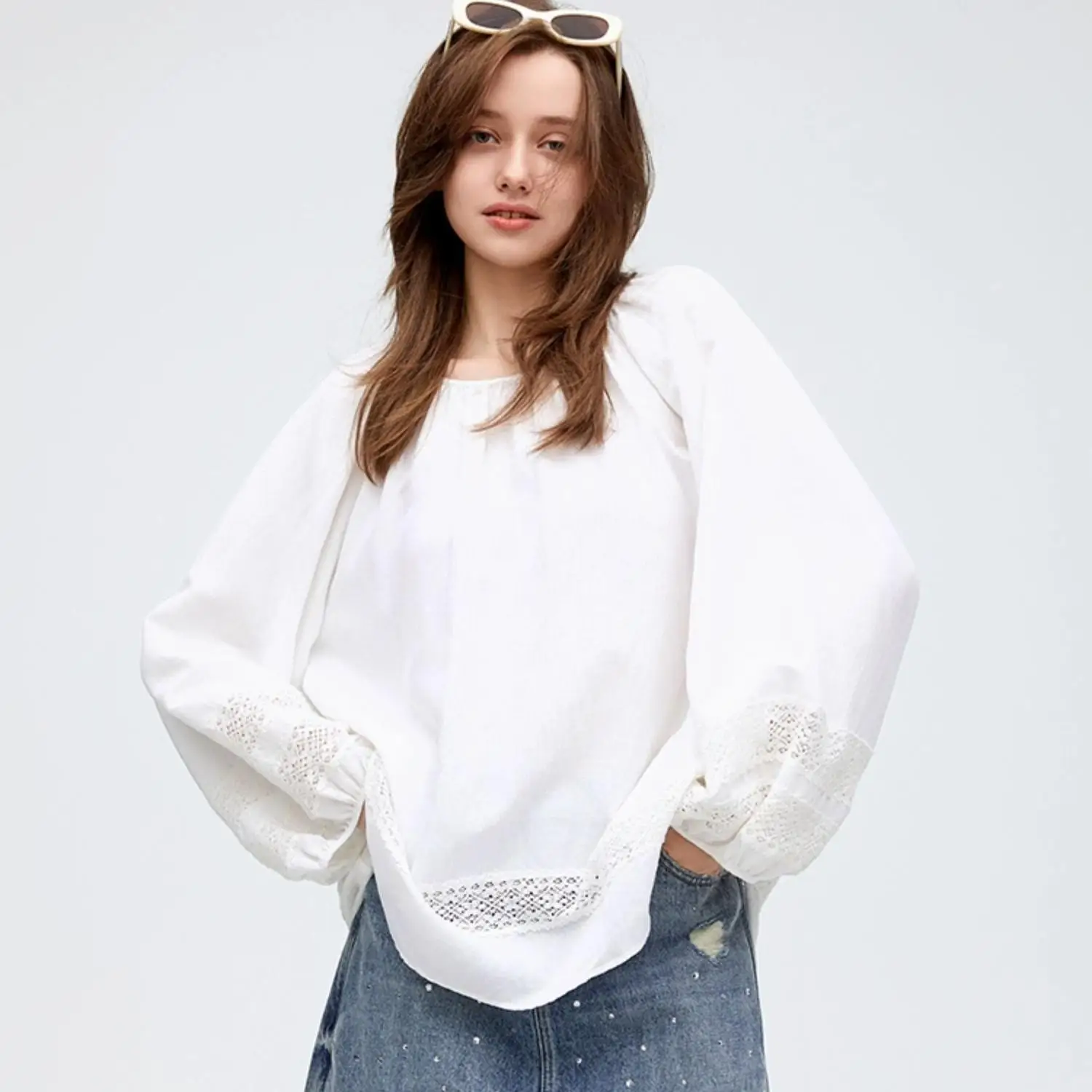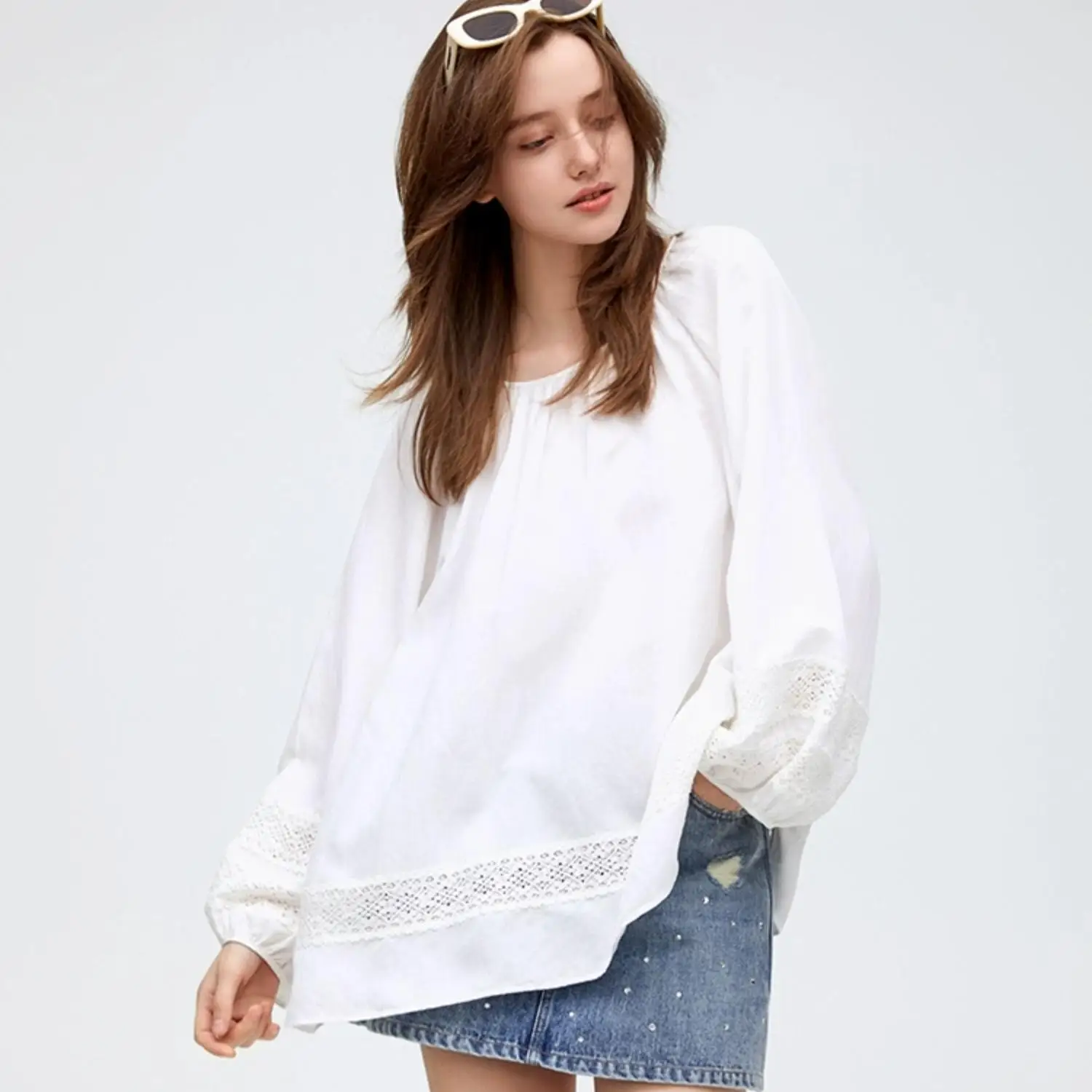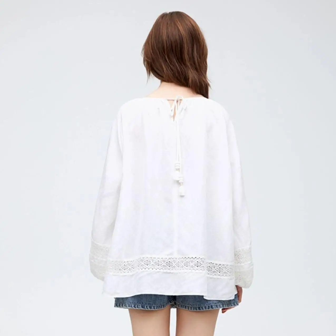 Custom Autumn Patchwork Lace Blouses Tshirts for Women Loose Long Sleeve Jacquard TShirts Casual Terry Fabric Compressed Feature