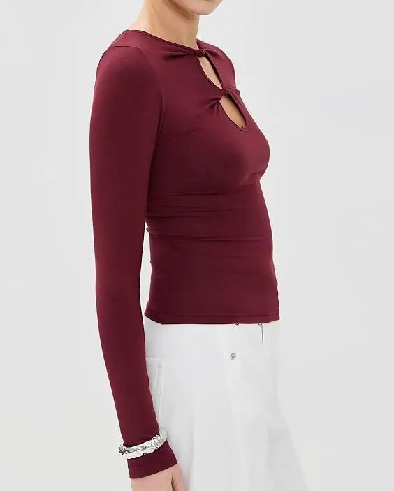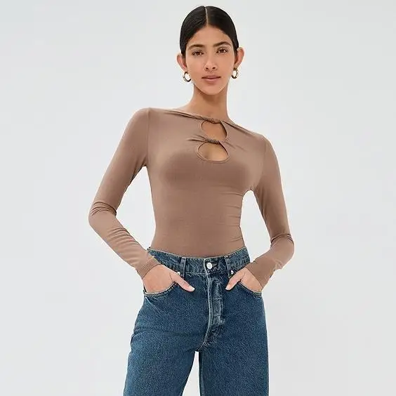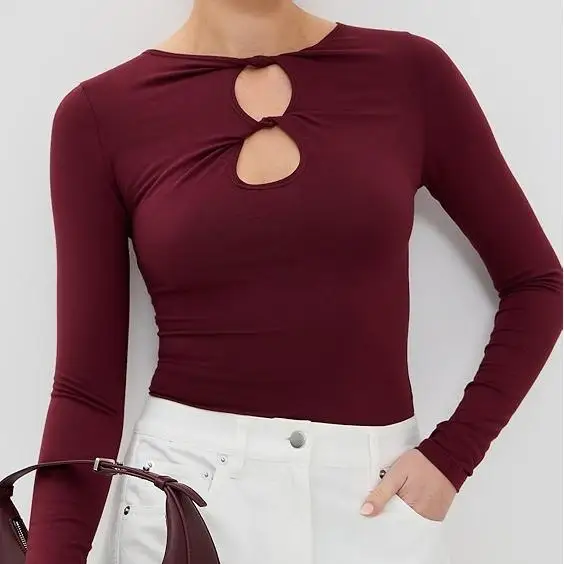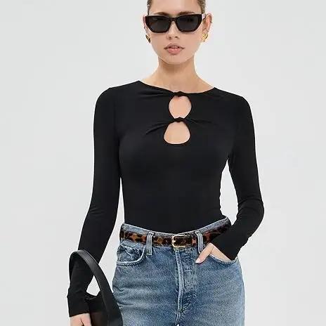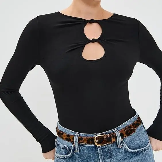 Women's Elegant Casual Black Long Sleeve Bodycon Tops Full Sleeve Shirts with Hollow Out Design Loose Fit T-shirts
