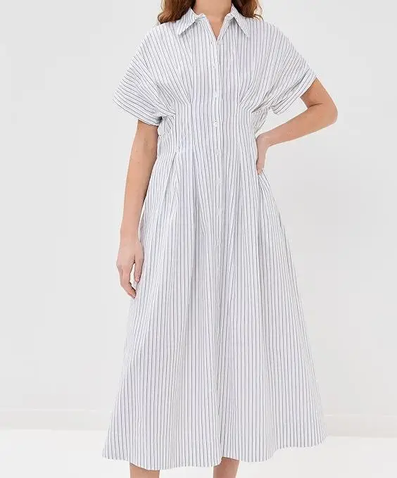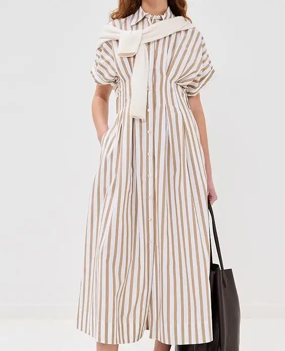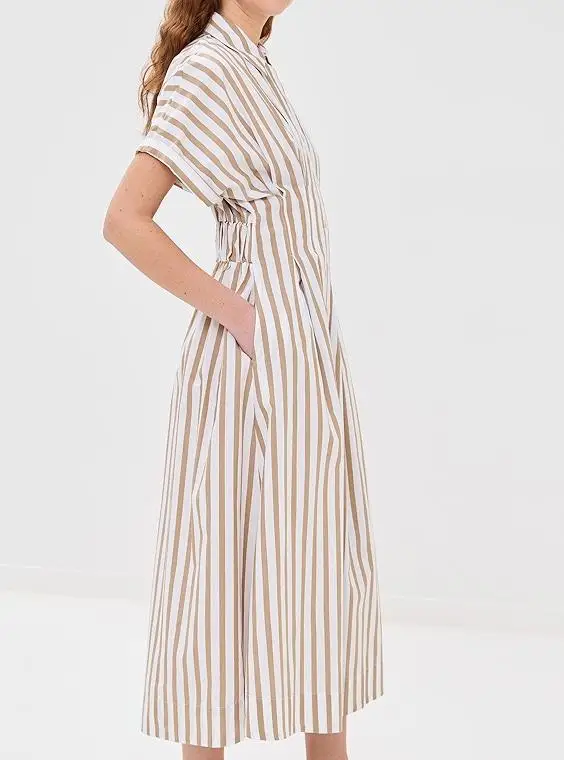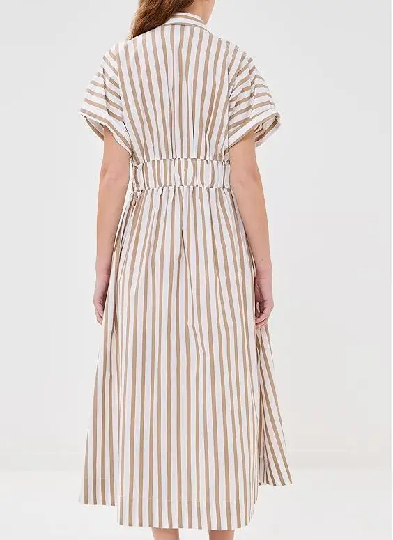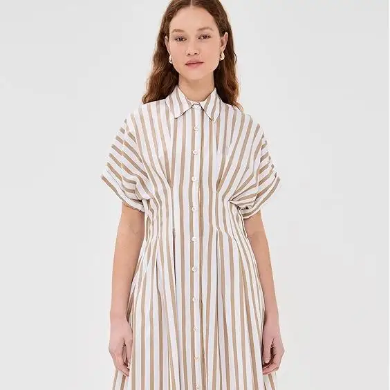 Custom Spring Strip Polo Collar Dress Short Sleeve Elegant Buttons up Casual Dress Casual Women Midi Linen Shirt Dress