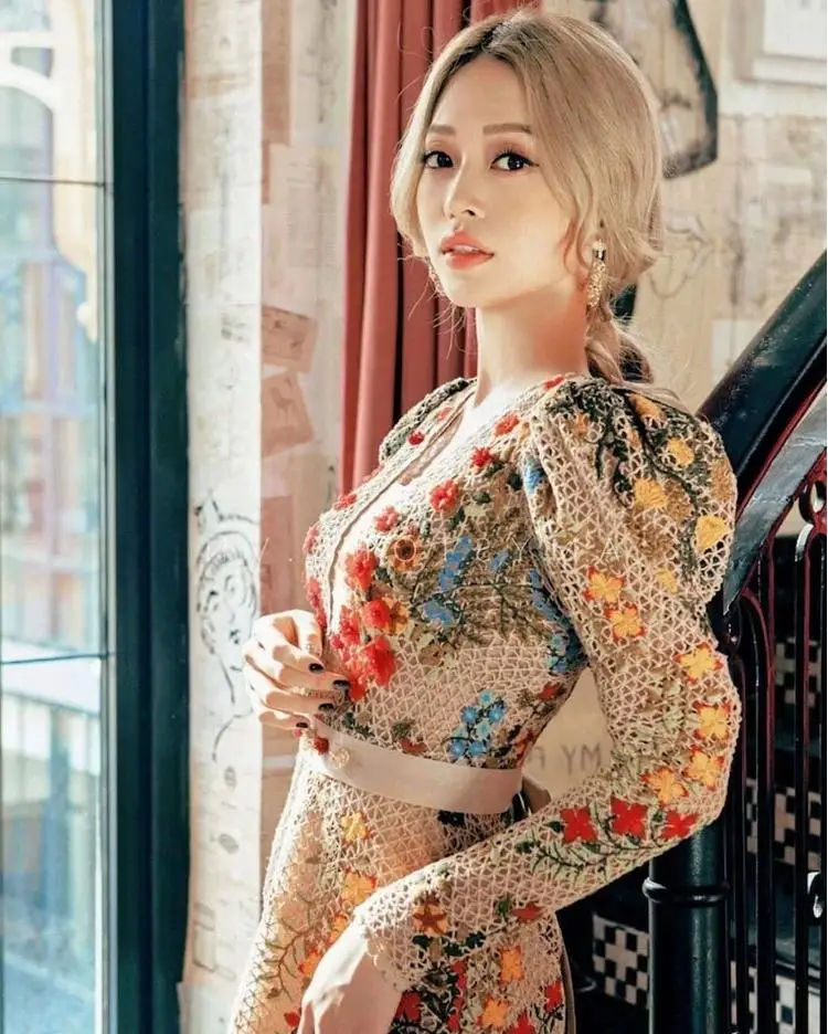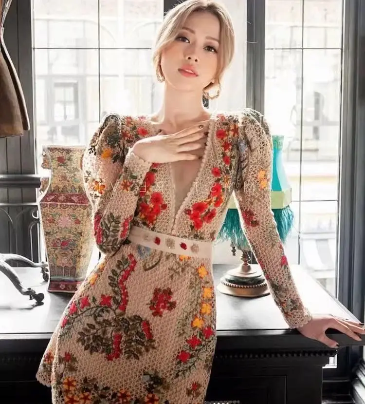 Pretty Flower Tulle Lace Fabric Dress with Long Sleeves & Ruffled Floral Embroidery Digital Printed Elegant and Feminine