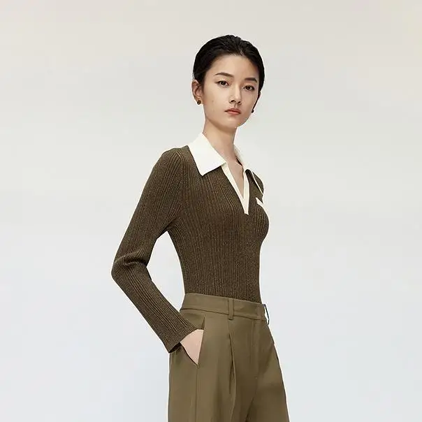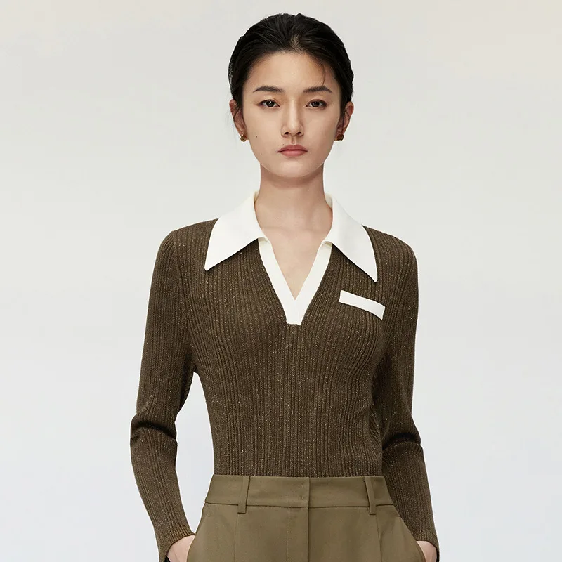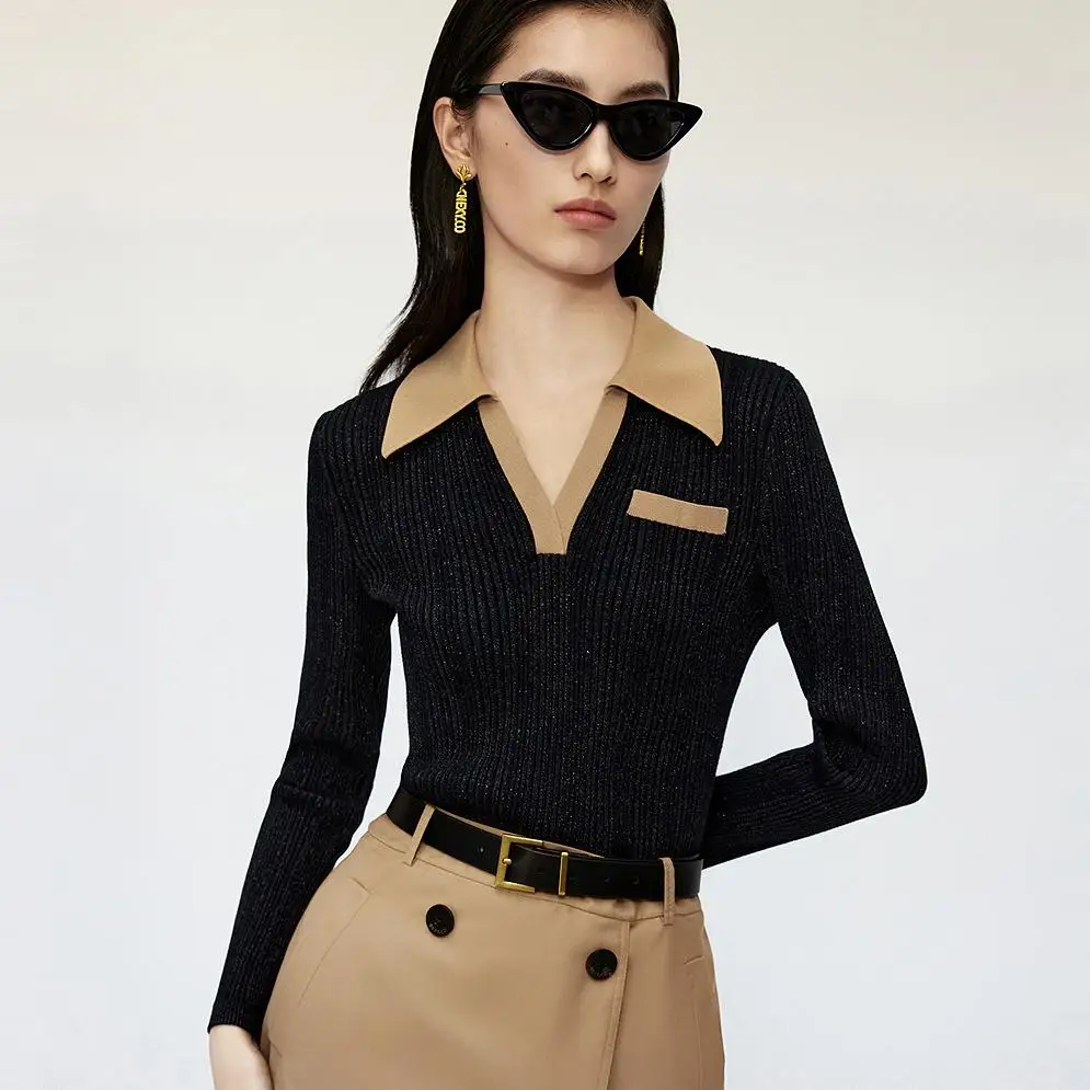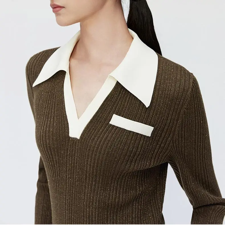 Color Block Turn Down Collar Pullover Sweater Elegant Ribbed Long Sleeve Knitted Sweater Top
