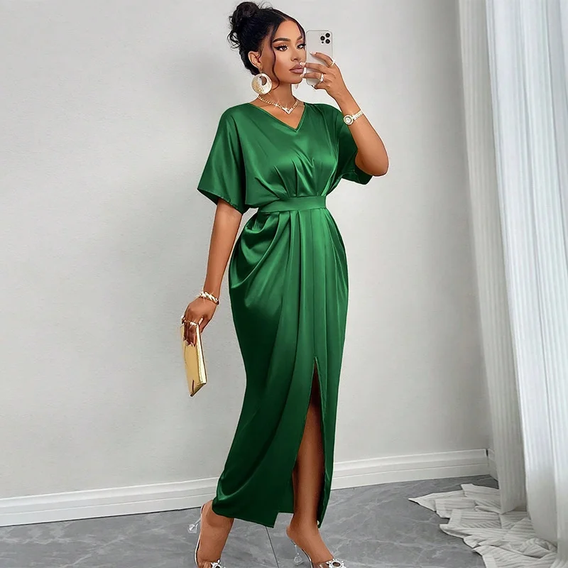 2025 Elegant Women's Office Casual Satin Skirt XL Solid V-Neck Short-Sleeved One-Step Slit Floor-Length Button Washable