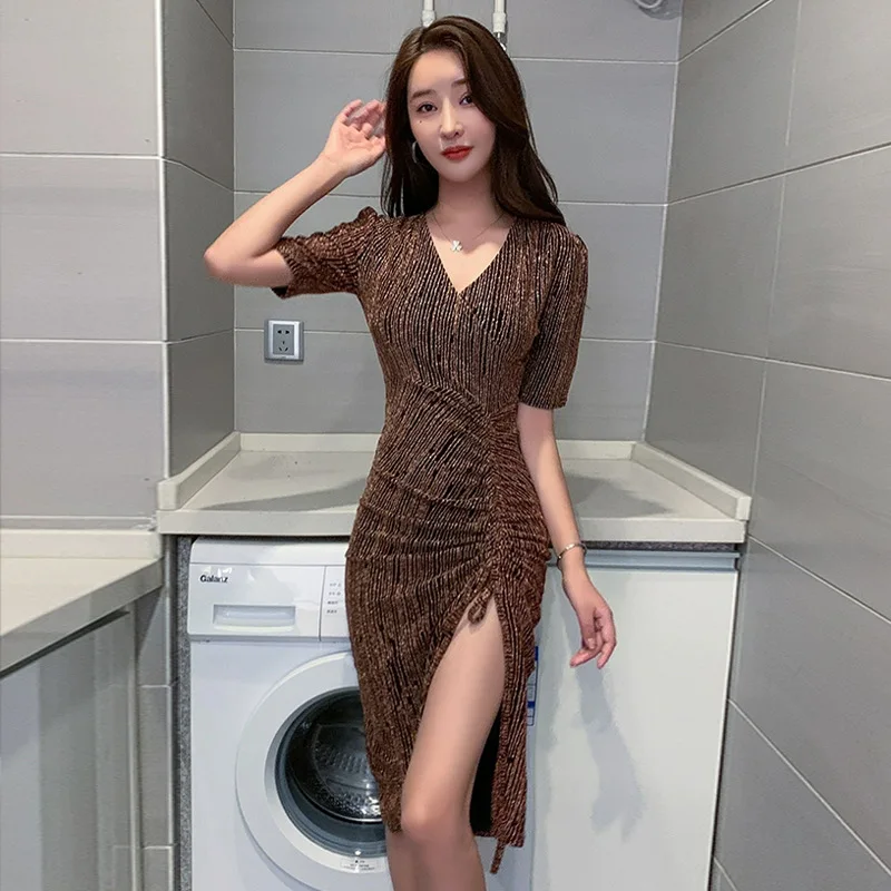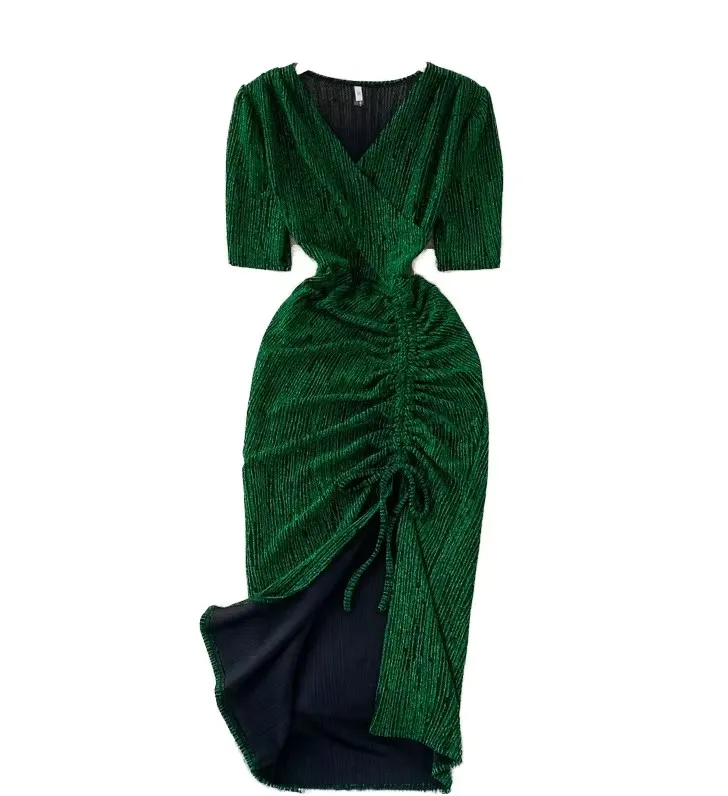 Women's Gothic Casual XL Floor-Length Chiffon Dress V-Neck Summer Slim Fit Cross-Border Shiny Sexy Slit Ruched Natural Washable