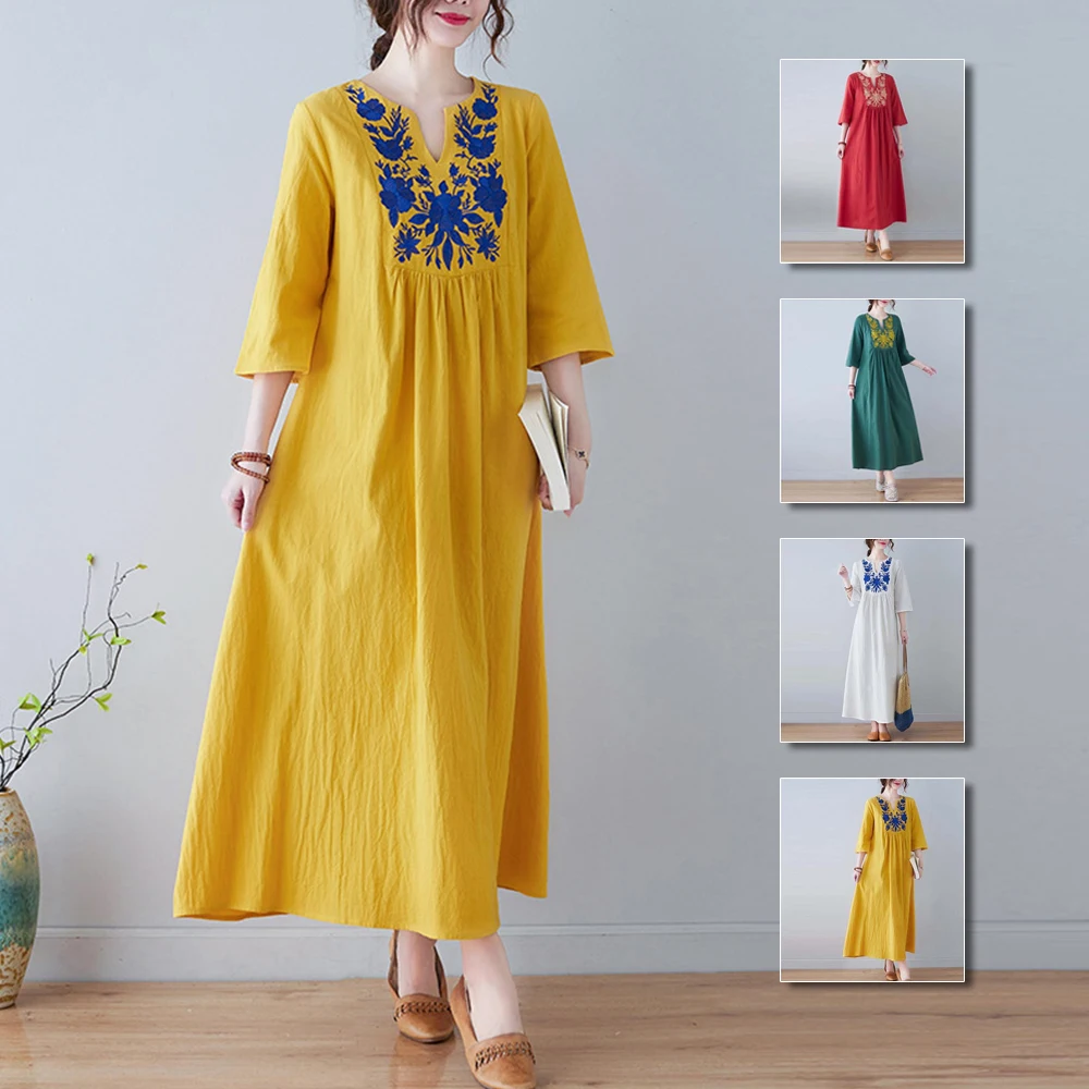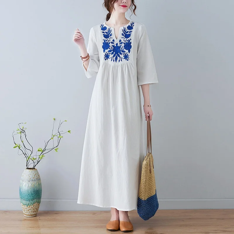2023 New Summer Vintage Woven Chiffon A-line Midi Dress Women Ethereal Embroidered V Neck Natural Real Shot Tailored Party