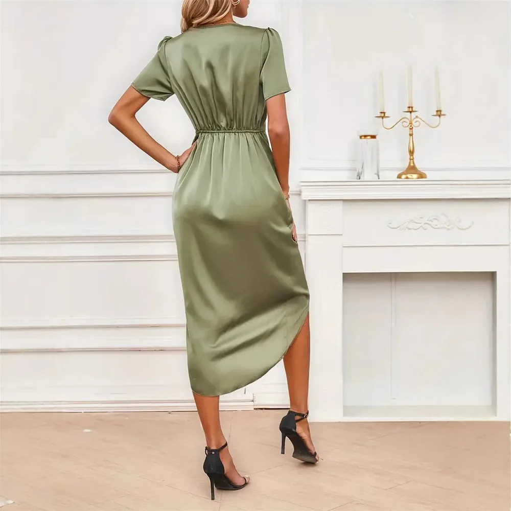 European American Women's Casual Long A-Line Satin Dress Button Irregular Design Cross Wrap Neck Short Sleeves Natural
