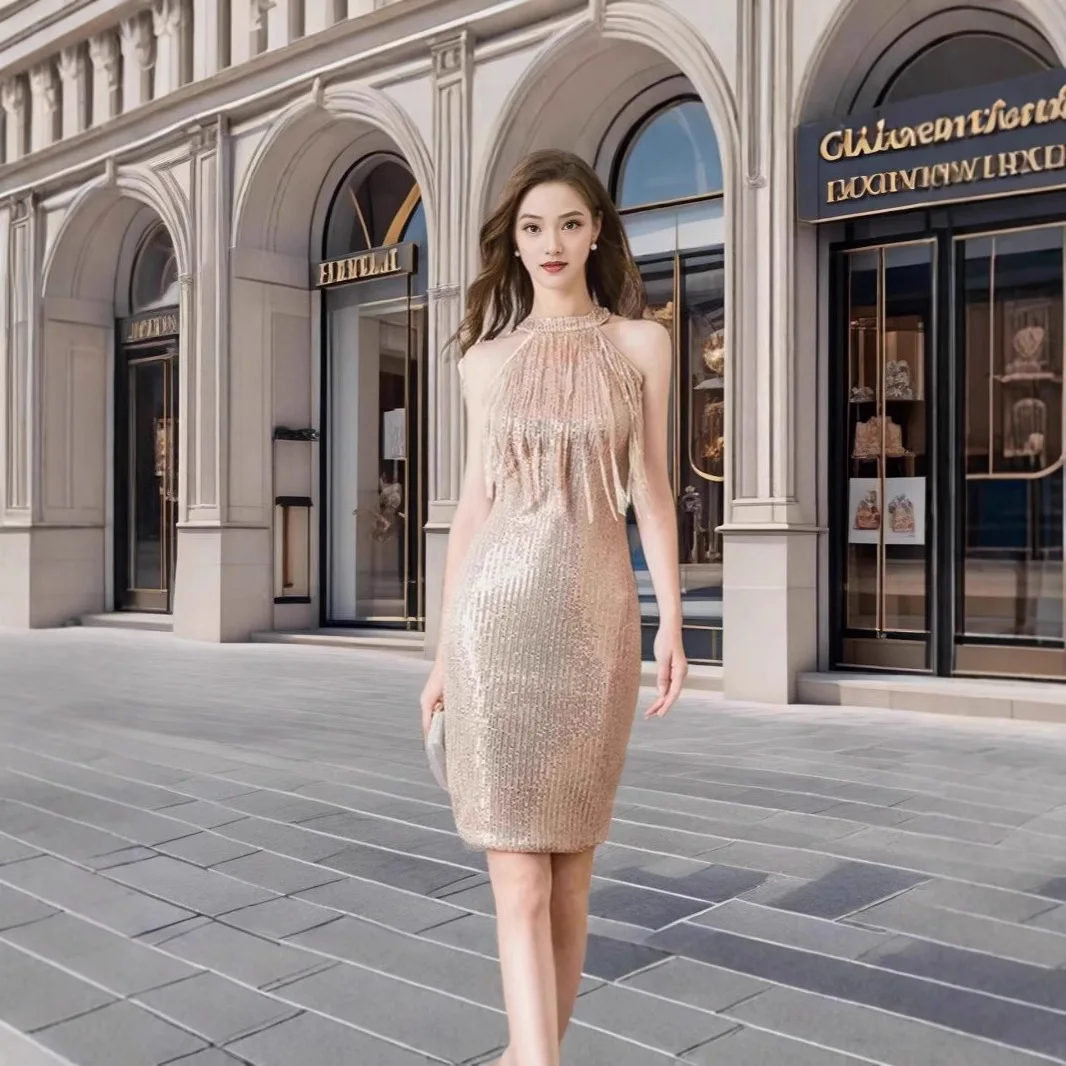 2025 European American Sexy Party A-Line Halter Chiffon Evening Dress Mid-Length Gown Sequin Tassel Natural Summer Nightclub