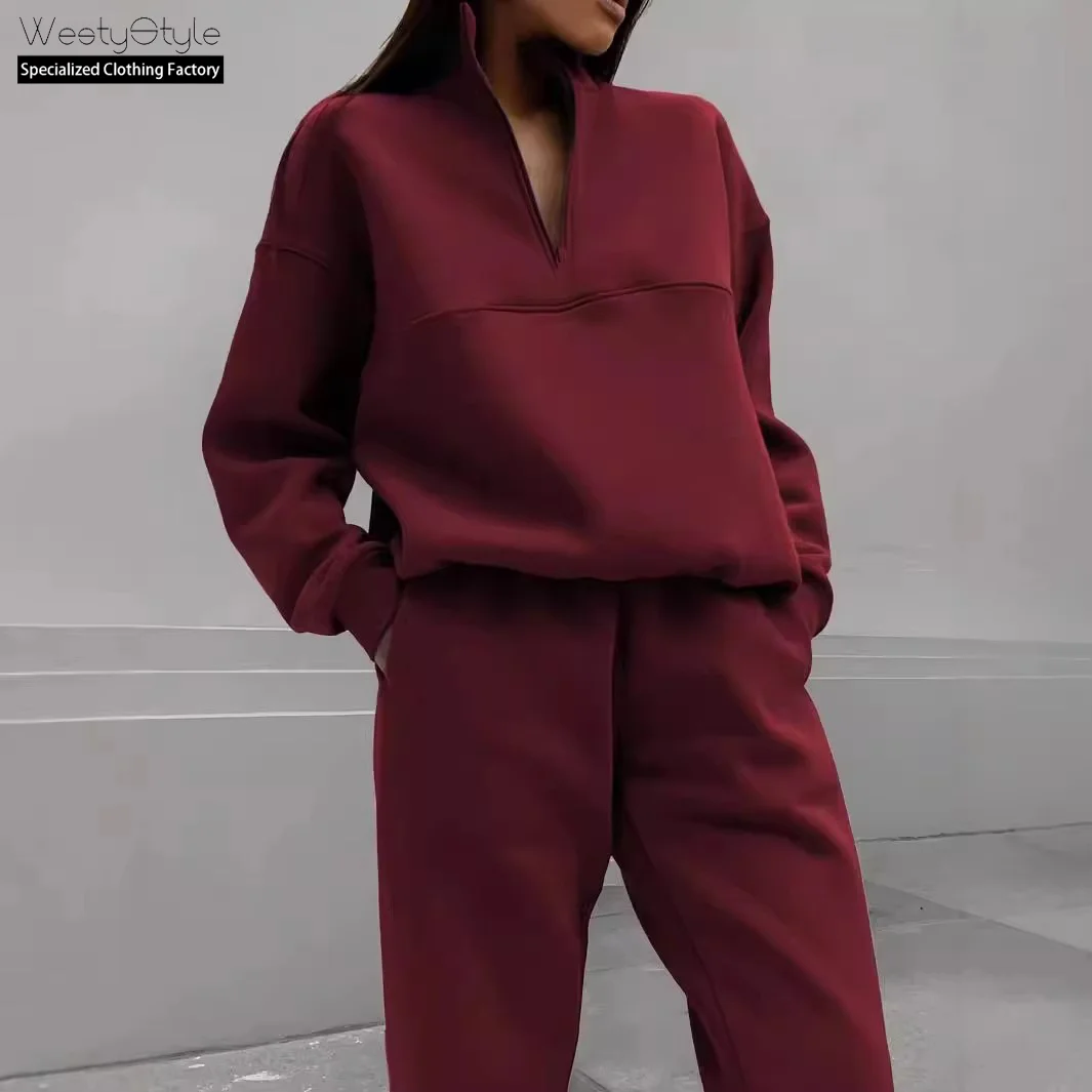 Vintage Hooded Autumn European American Solid Two-Piece Sweat Pants Suit All-Match Fashion Casual Thickened Long