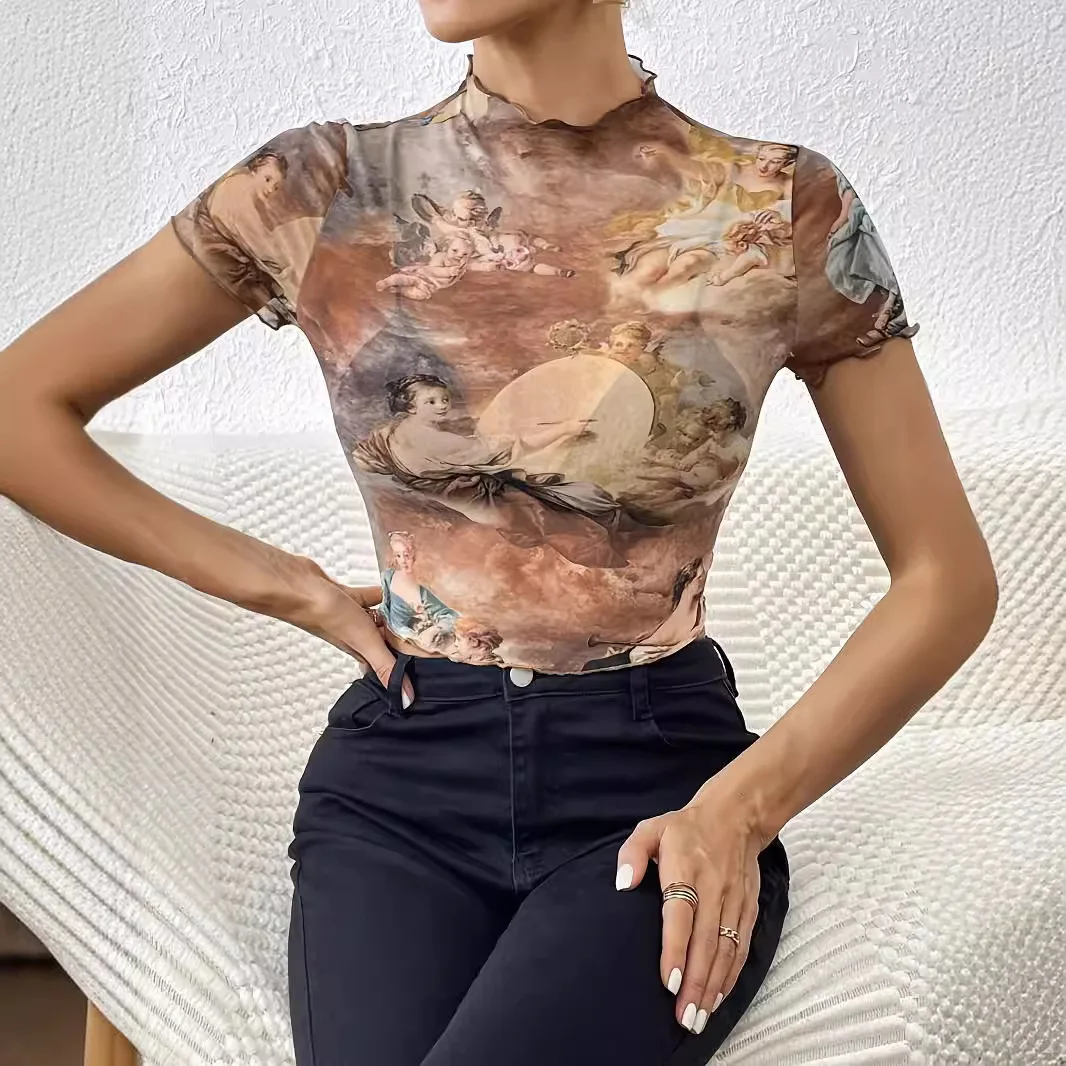 2026 European American Women's Floral Mesh Short-Sleeved T Shirt Elegant Slimming Casual Summer Style Fitted Polyester Digital