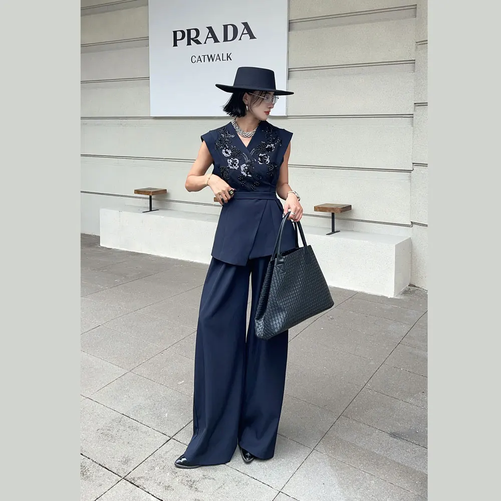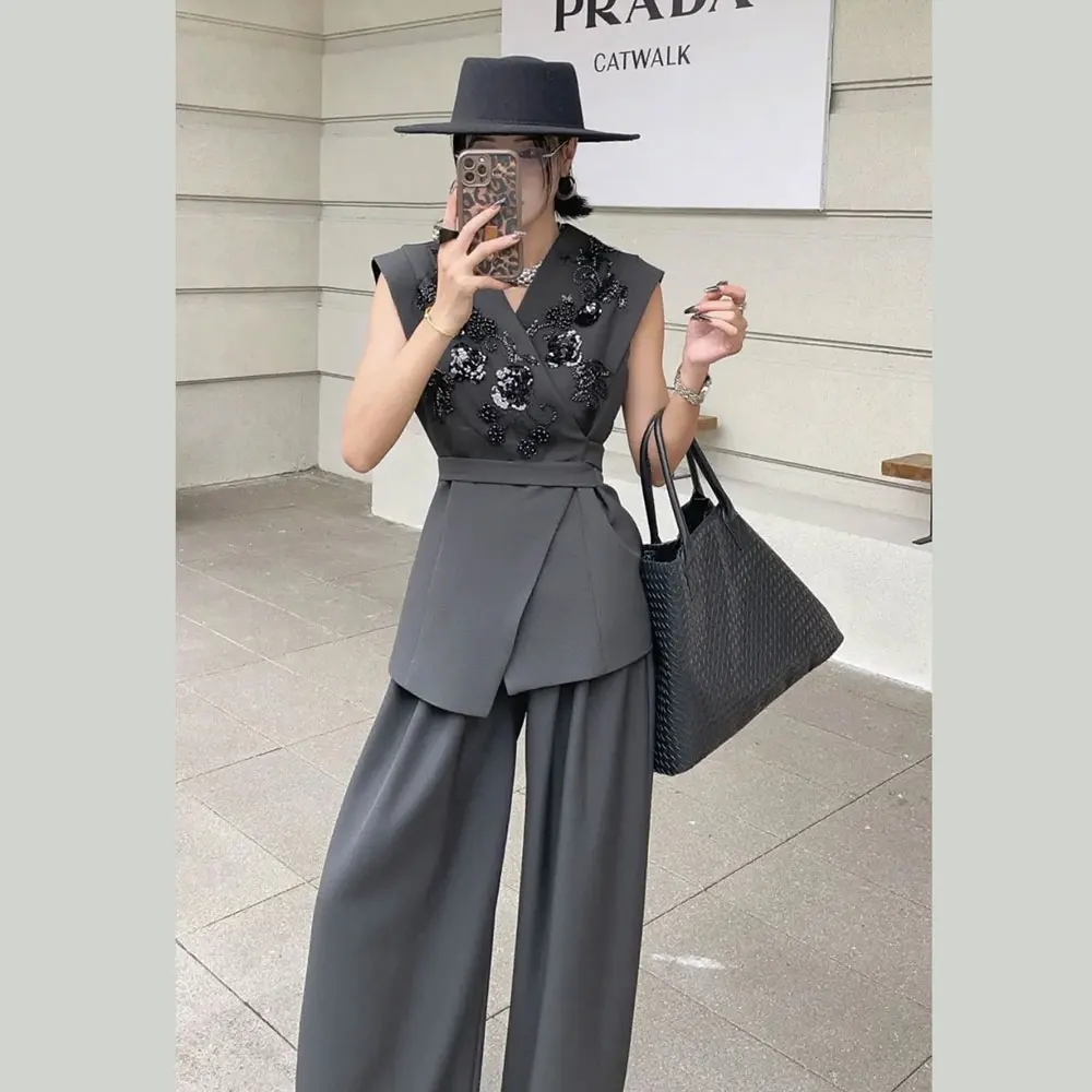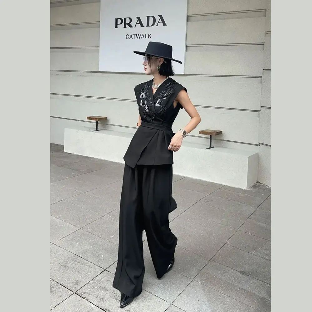 Women's Beaded 2-Piece Suit Set - Vest & Jacket, Elegant, Modern, Perfect for Office & Events, with Lining
