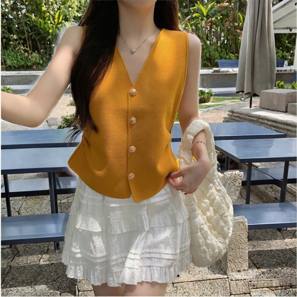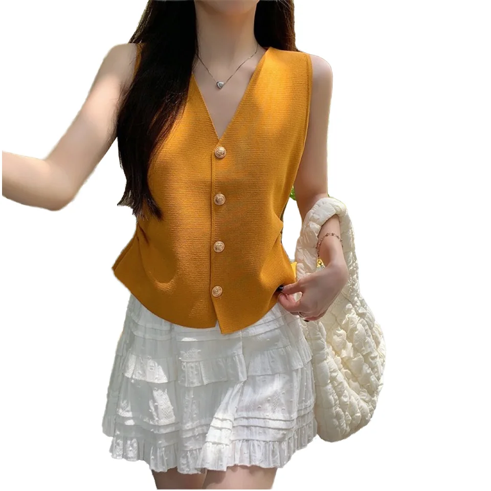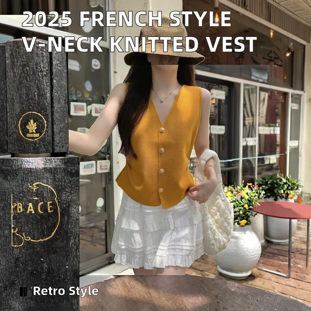 2025 Summer New Women's French Style Single-Breasted V-Neck Woolen Knitted Vest Slim Fit Outerwear Top with Button Decoration