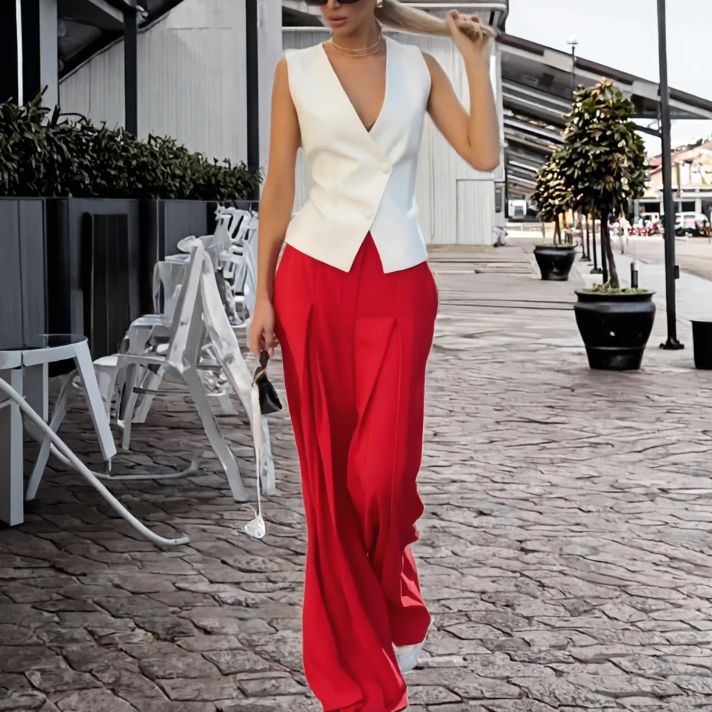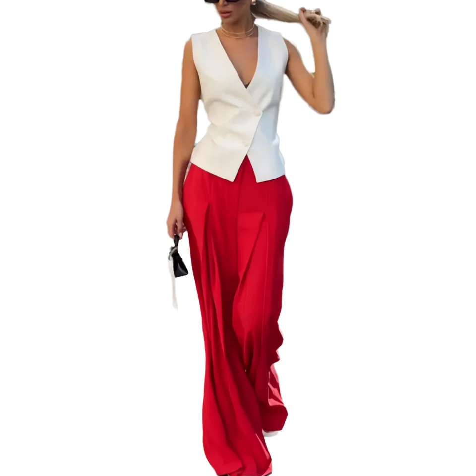 Summer Fashion V-neck Sleeveless Short Solid Woven Terno Two Piece Set for Women Casual High Waist Wide Leg Pants