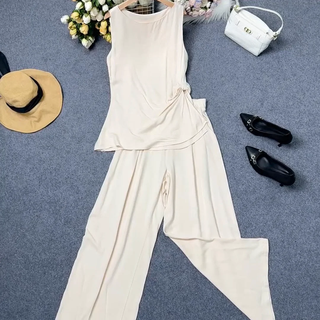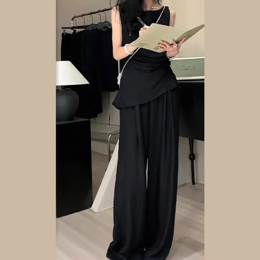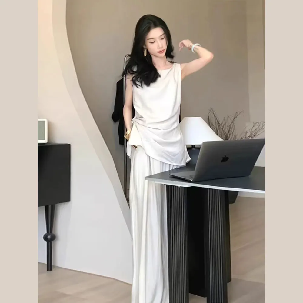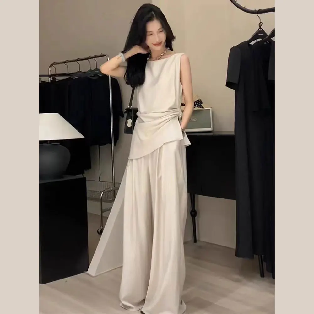 Customized Fashion Two-piece Women's Casual Temperament Elegant Sleeveless Shirt and Wide Leg Casual Pants